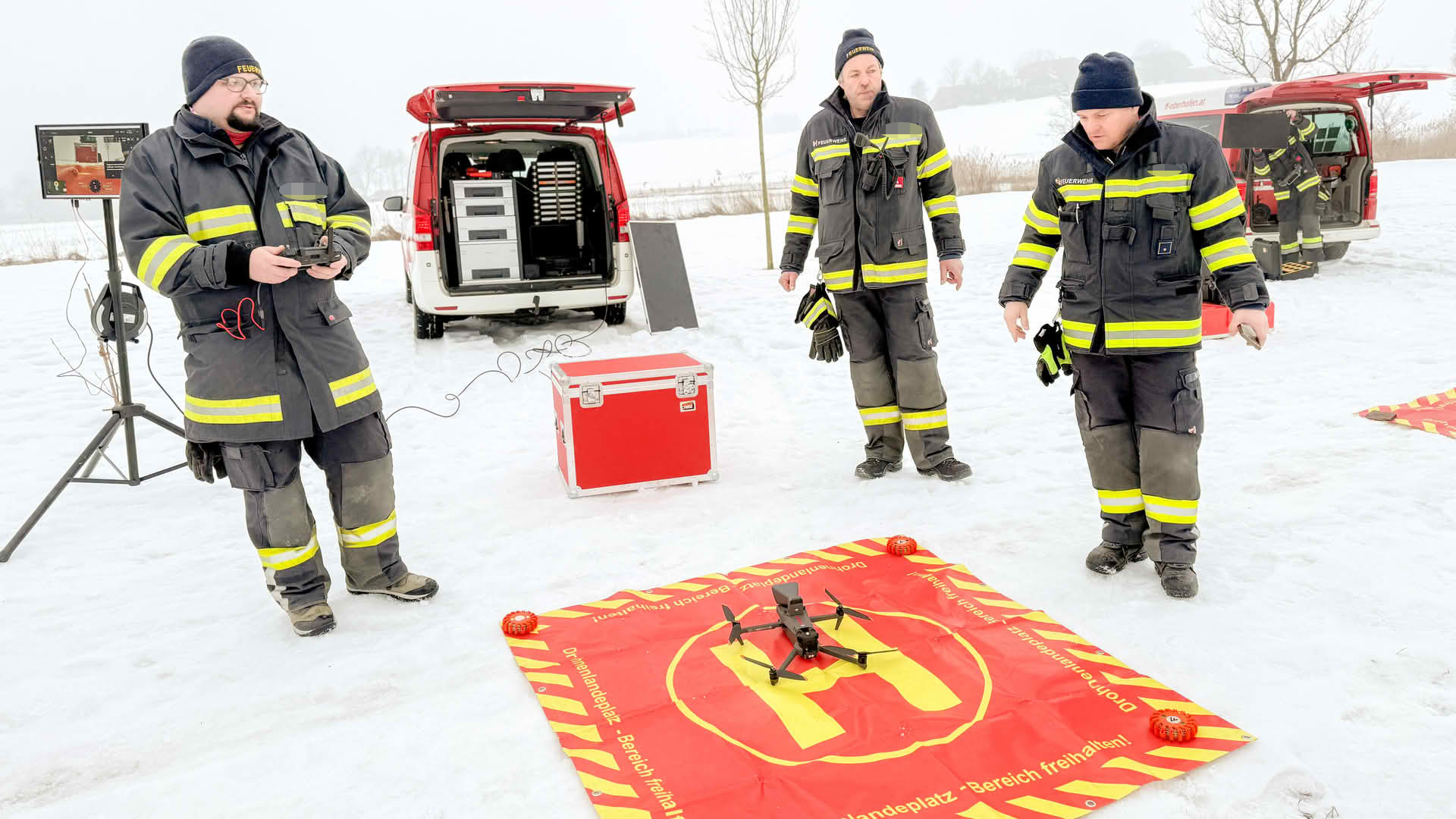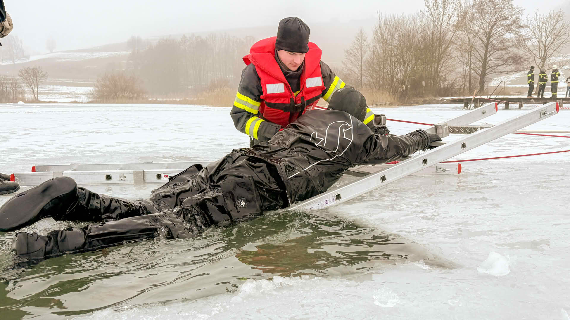 Am See wurde dann mit verschiedenen Einsatzmitteln die Rettung einer eingebrochenen Person geübt. Die Drohnen der Feuerwehrdrohnengruppe des Abschnitts Mondsee kümmerten sich um die Lagedarstellung und die Räumung des Gefahrenbereichs mittels Lautsprecherdurchsagen. Aufgrund des Nebels, der hohen Luftfeuchtigkeit und der Temperatur von -2 Grad kam es immer wieder zu leichten Propellervereisungen, somit konnten Drohnenflüge nur sehr selektiv und in geringer Höhe erfolgen.
