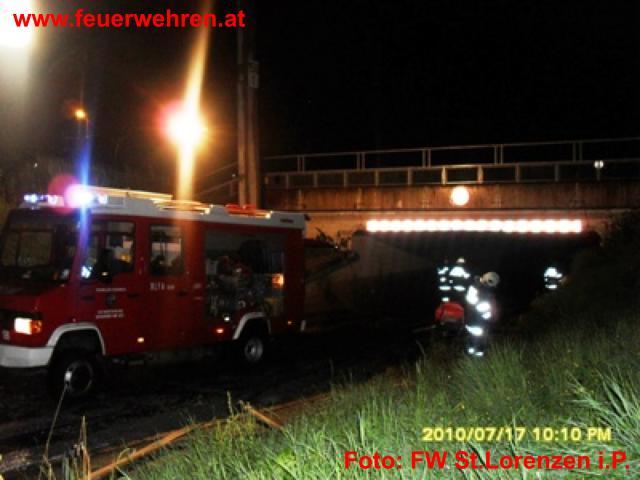 Gleichzeitig wurde auch die ÖBB Unterführung überflutet und ein PKW von den Wassermassen eingeschlossen. Die Insassen konnten sich jedoch selbst befreien. Zur Unterstützung der Auspumparbeiten und PKW Bergung wurde noch die FF Gaishorn mit RLF und Tauchpumpe angefordert.