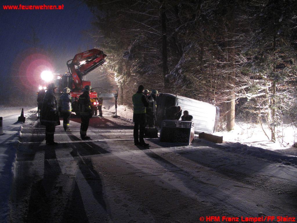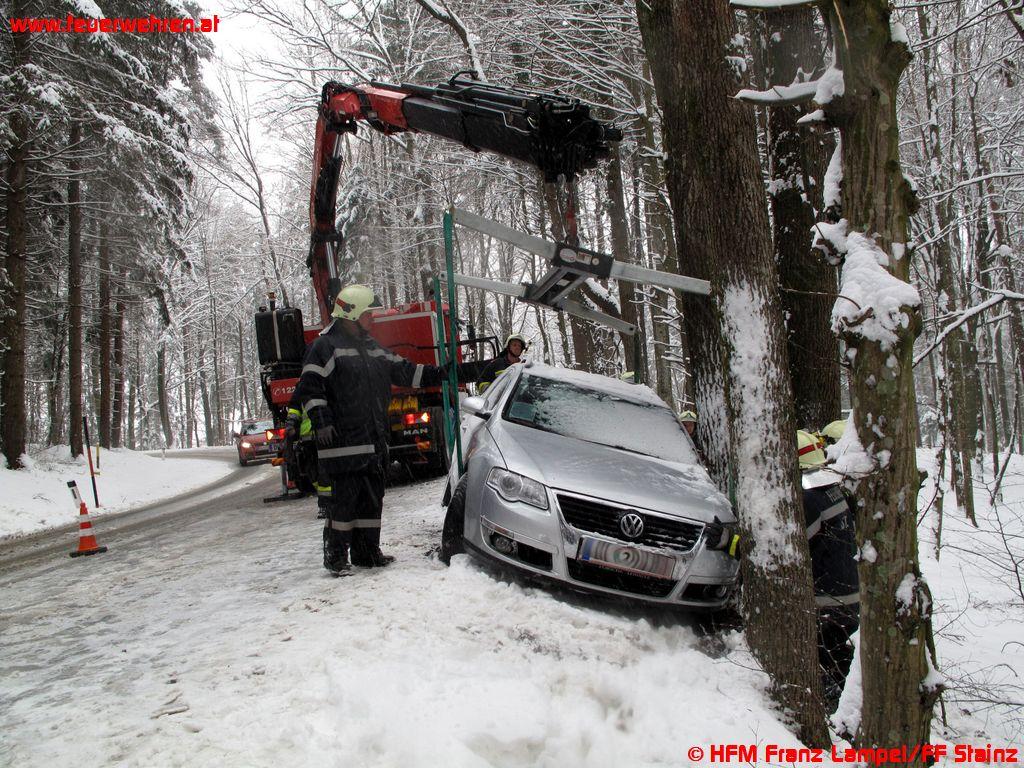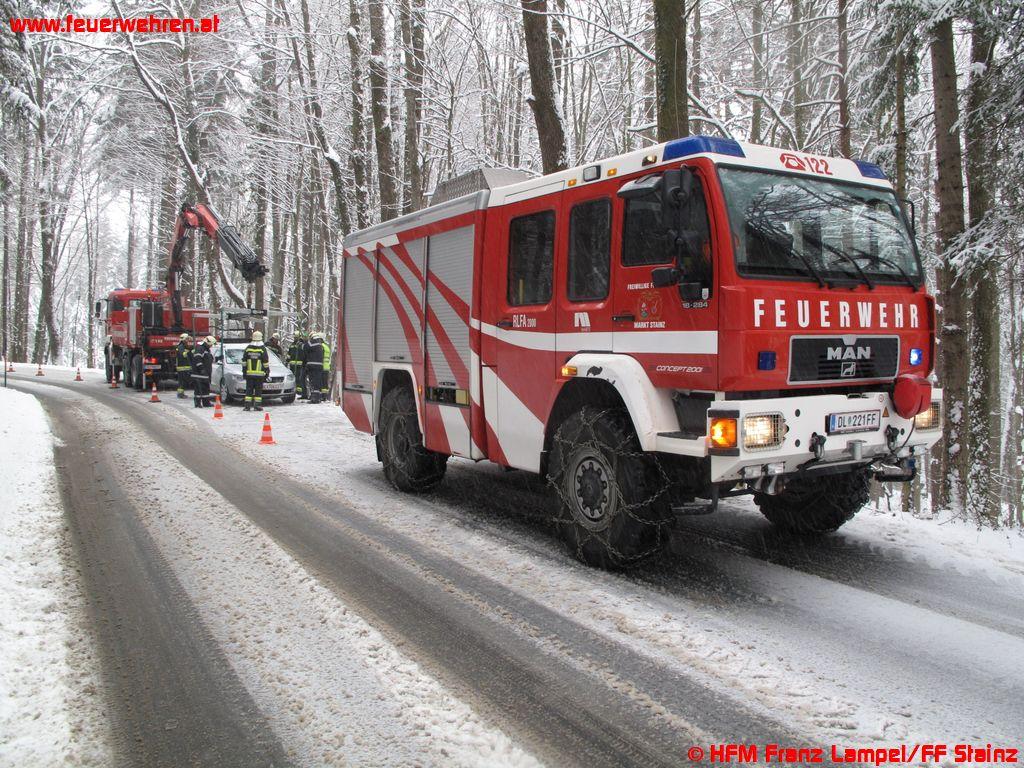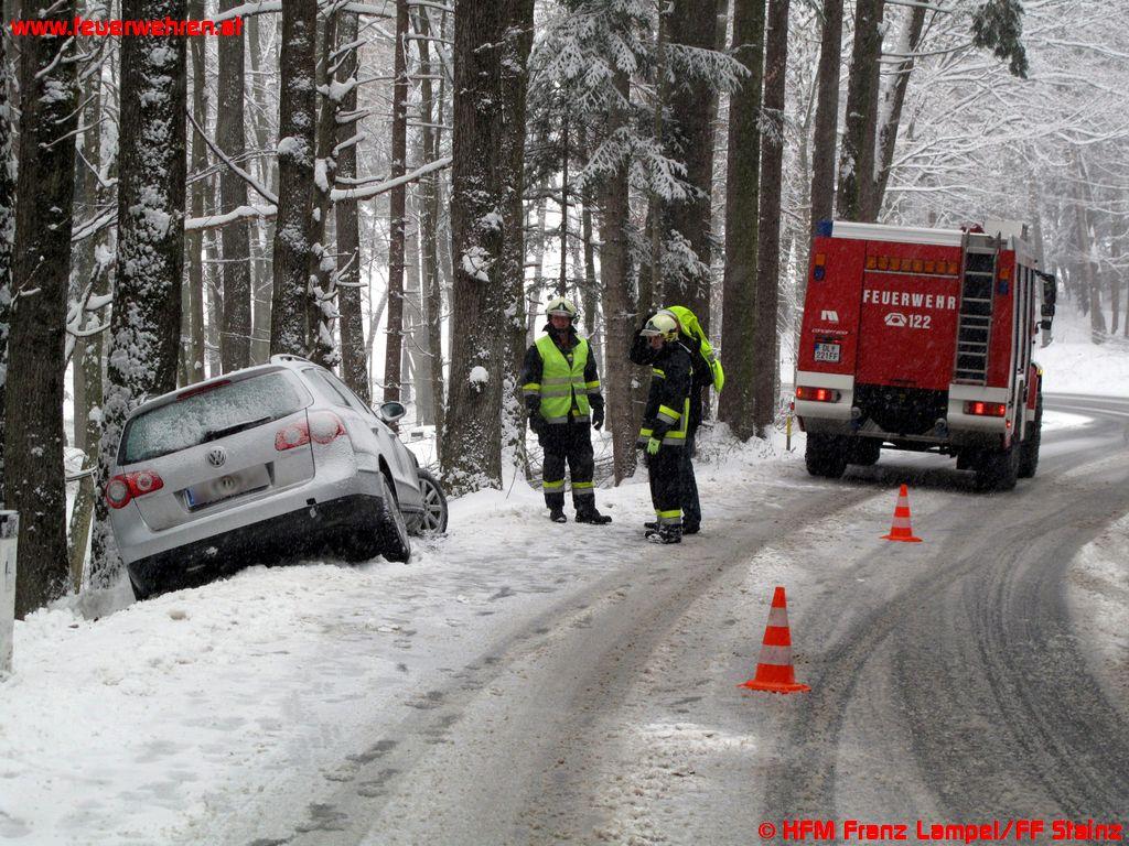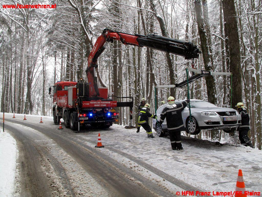 Bereits zu ihrem dritten Einsatz mit geringem Sachschaden innerhalb von 24 Stunden musste die Stainzer Feuerwehr am Dienstagnachmittag ausrücken. Ein Fahrzeuglenker kam aufgrund der schneeglatten Fahrbahn von der L643, der Bad Gamserstraße, ab. Nach Absicherung der Unfallstelle wurde der PKW mittels Ladekran wieder zurück auf die Fahrbahn gehoben. Der PKW konnte aber die Fahrt aus eigener Kraft fortsetzen.