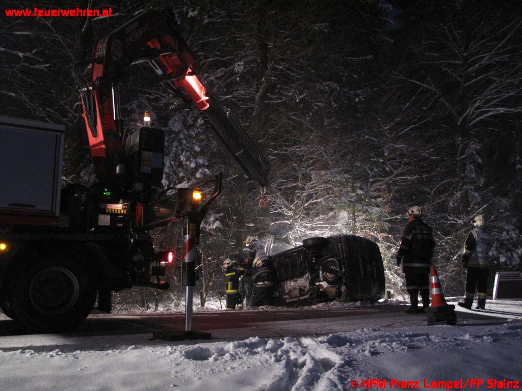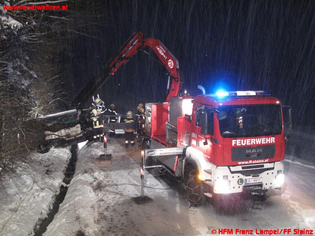 Am Abend wurde die Feuerwehr Stainz, gegen 18:30 Uhr, zur nächsten Fahrzeugbergung nach einem Verkehrsunfall von der Einsatzleitung der FF Neudorf bei Stainz alarmiert. Auf der L617, in der Gemeinde Stainztal, ist ein Fahrzeuglenker mit seinem VW-T5, Richtung Stainz, aus noch ungeklärter Ursache von der Straße abgekommen und kam seitlich zu liegen. Das Fahrzeug wurde dabei schwer beschädigt und der Insasse unbestimmten Grades verletzt. Er wurde von der Rettung ins Krankenhaus gebracht. Ein im Fahrzeug befindlicher Hund wurde durch den Aufprall ebenfalls verletzt und von einem Tierarzt betreut. Während der Bergungsarbeiten war die Landesstraße bis etwa 20 Uhr in beiden Richtungen gesperrt.