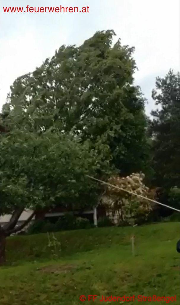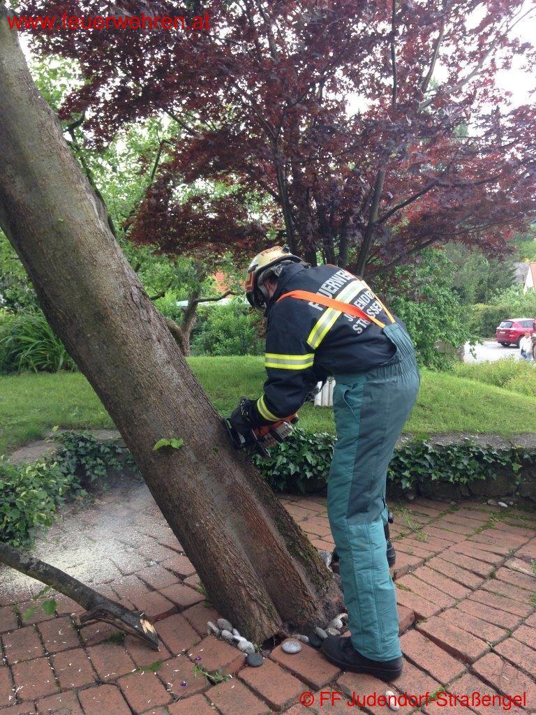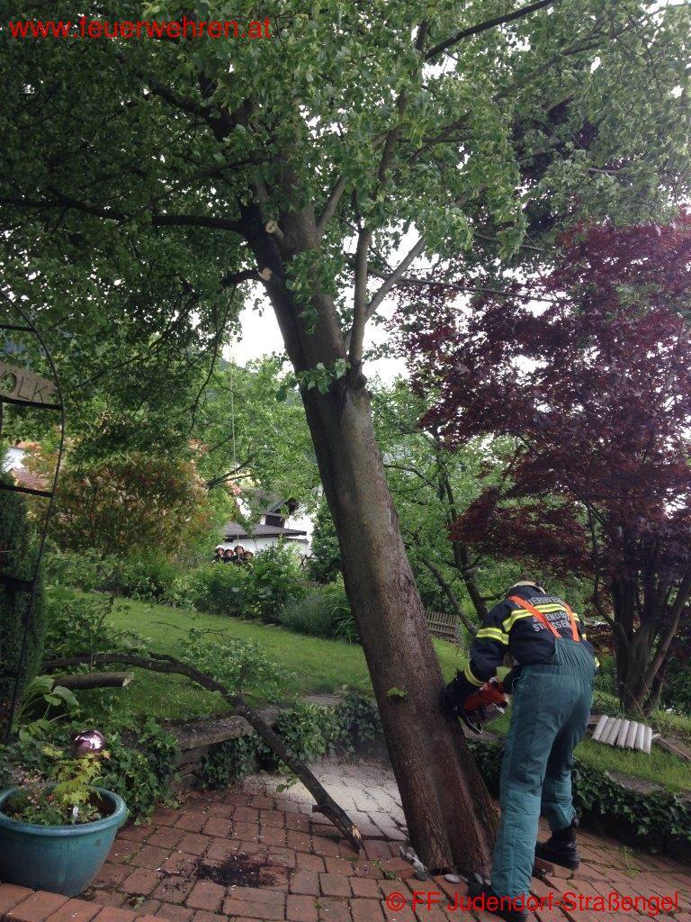 Am Mittwoch den 15.05.2014 kam wie bereits aus den Medien und den Unwetterzentralen vorhergesagt, sehr starker Wind im Ortsgebiet auf. Aufgrund der starken Sturmböen löste sich ein Baum aus dem bereits sehr feuchten Erdreich und drohte auf ein Einfamilienhaus zu stürzen.