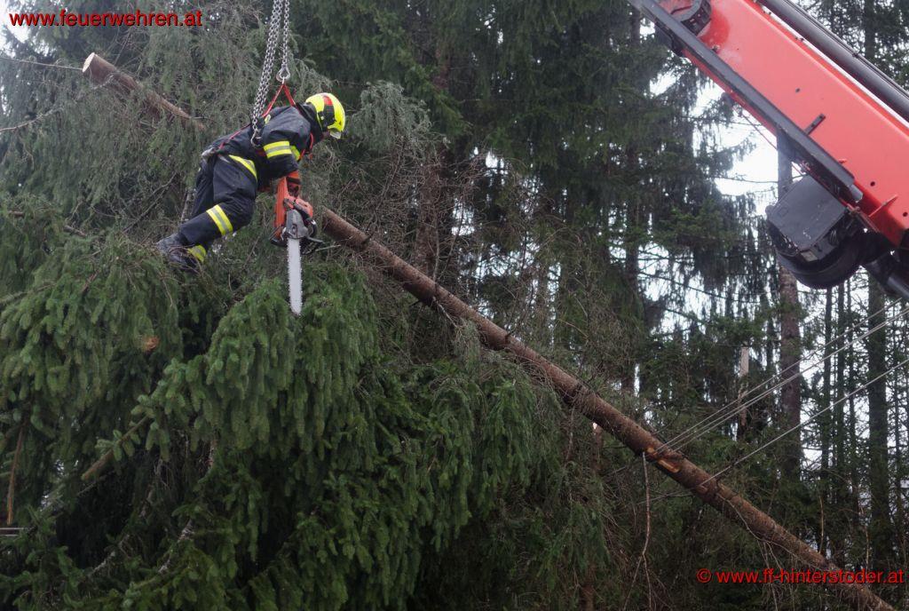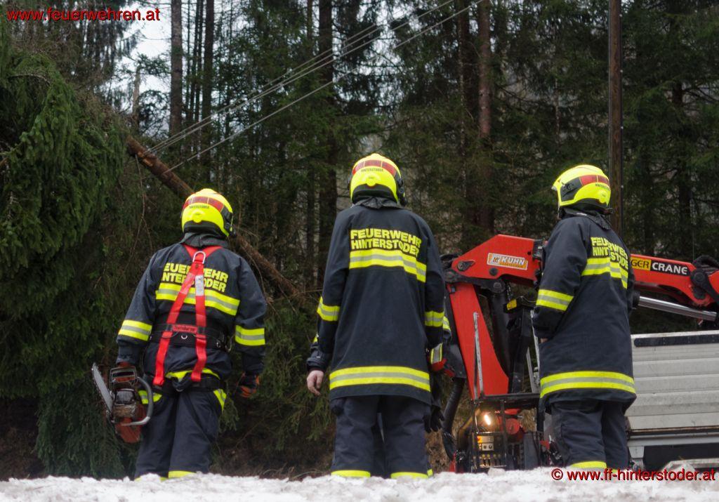 In einem ersten Schritt wurden die Bäume von der Straße entfernt und die Bereiche abgesichert in denen sich herunterhänge Kabel befanden. Weiters wurde der Durchlass geräumt. Nach dem Eintreffen der Mitarbeiter der Energie AG wurden die Leitungen stromfrei geschalten und geerdet. Unter Zuhilfenahme eines Kranfahrzeuges wurde ein Feuerwehrmitglied zu dem in der Stromleitung hängenden Baum gehoben. Dieser wurde dann entfernt.