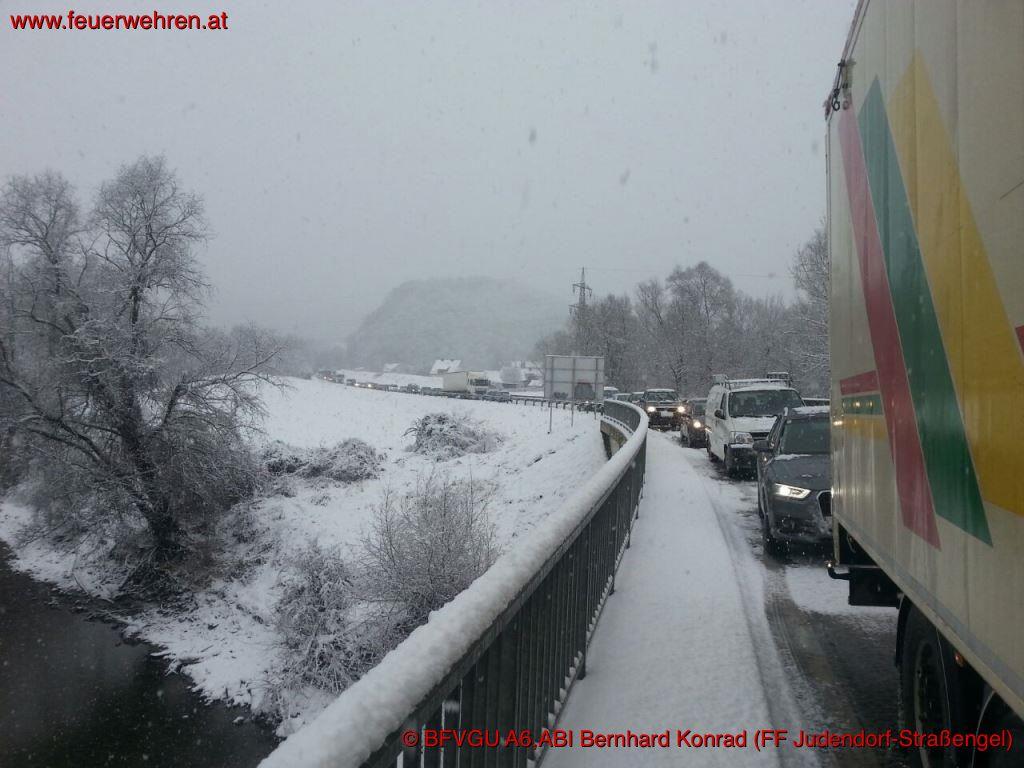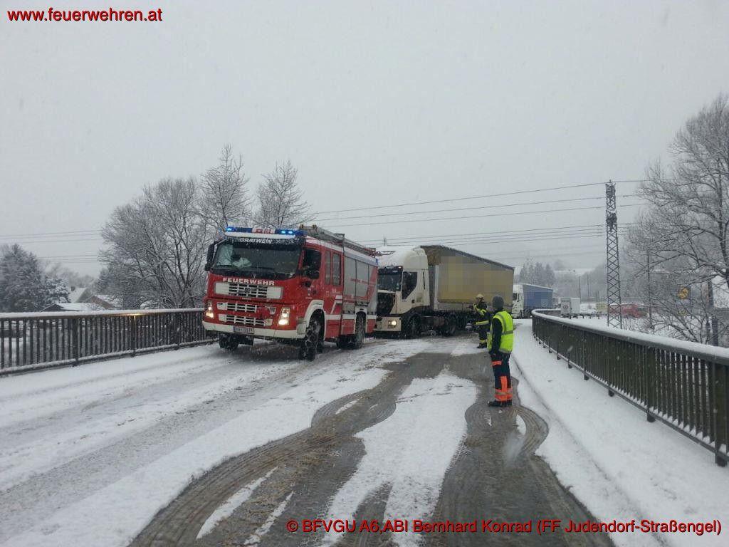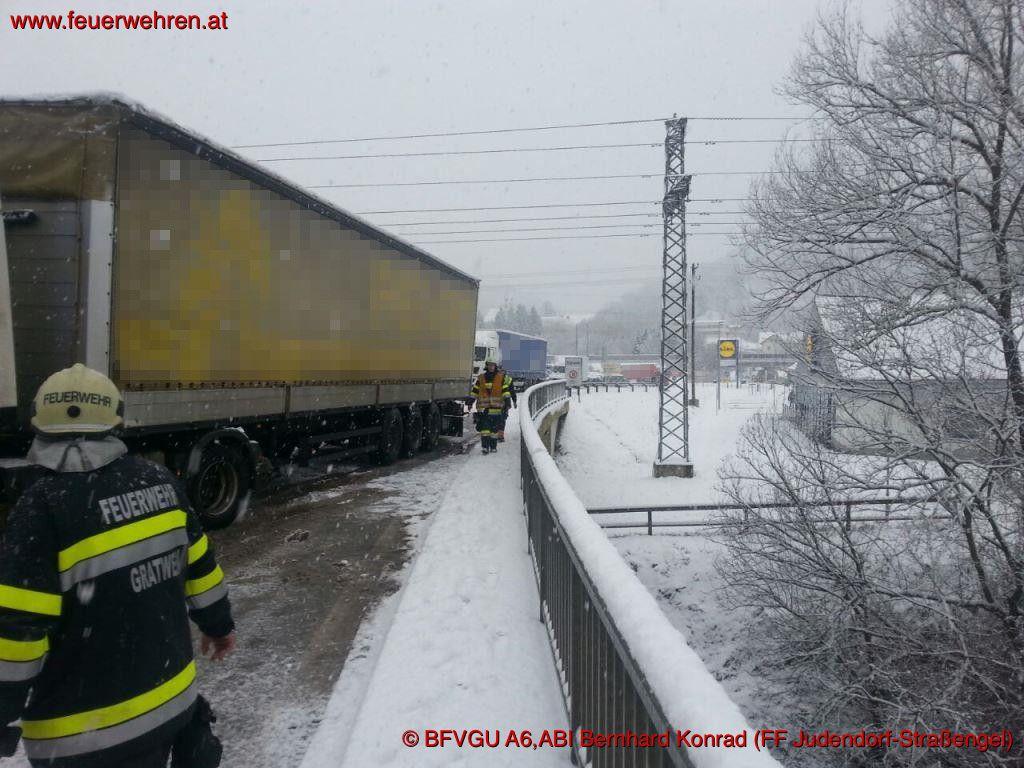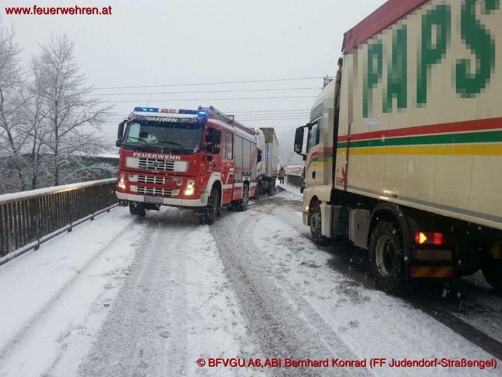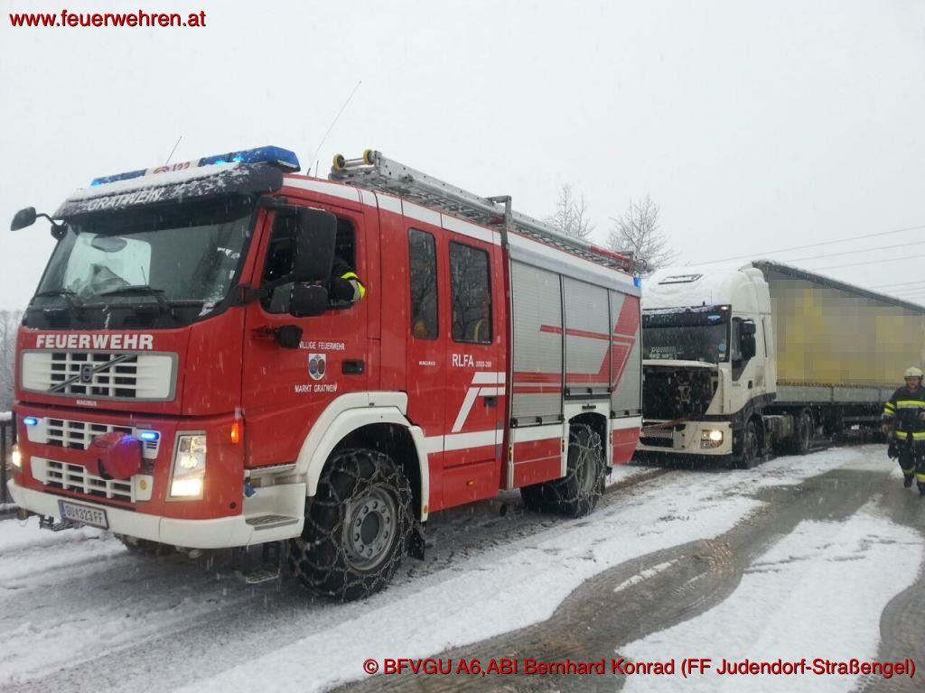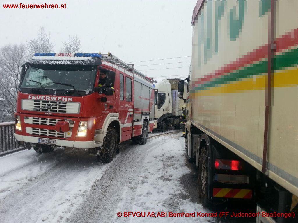 Gleichzeitig zum Unfall auf der Landesstraße blieben mehrere LKW-Züge, weil sie ohne Schneeketten unterwegs waren, beim Kreisverkehr aufgrund der Schneefahrbahn liegen. Die Feuerwehren von Gratwein und Judendorf-Straßengel rückten mit zwei Rüstlöschfahrzeugen und einem Tanklöschfahrzeug zum Einsatz aus. Die Mannschaft aus Judendorf-Straßengel kümmerte sich daraufhin um den Verkehrsunfall, bei dem es Gott sei Dank keine eingeklemmte Person zu retten gab. Die FF Gratwein übernahm die LKW-Bergungen. Von der Feuerwehr Gratkorn, die noch beim Verkehrsunfall auf der Autobahn im Einsatz stand, konnte ein Teil der Mannschaft abgezogen werden, um eine Umleitung des Verkehrs auf der Gratkorner Seite der Landesstraße einzurichten. Die Betriebsfeuerwehr der Papierfabrik Sappi unterstützte diese Arbeiten und empfahl den im Rückstau stehenden LKW-Lenkern das Auflegen von Schneeketten.