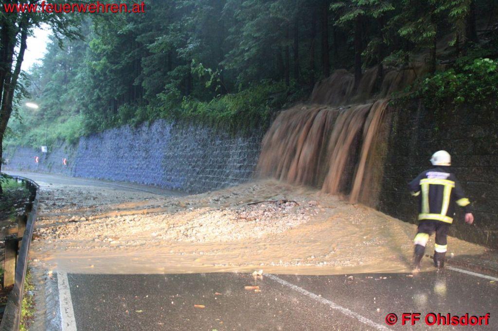 Die Ohlsdorfer Landesstraße wurde im Bereich der Traunbrücke von einer Meterhohen Schottermure vergraben. Es wurde mit einem Radlader versucht den Schotter zur Seite zu bringen. Weiterer Regen könnte hier die Situation noch verstärken, deshalb bleibt die L1303 in diesem Bereich für den Verkehr gesperrt. Eine örtlich Umleitung wurde eingerichtet.