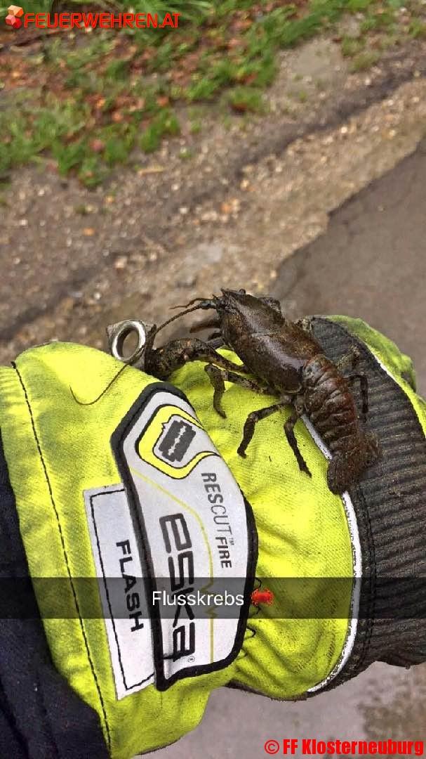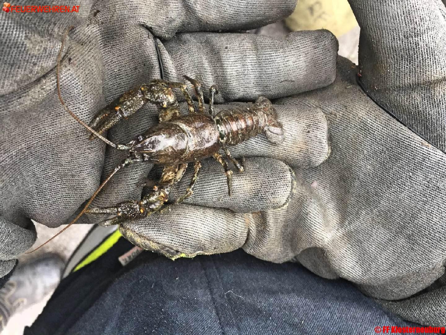 Ein hilfloser Flusskrebs geriet durch die starke Strömung unter einer Betonplatte in Not und wurde von den Feuerwehrmitgliedern gerettet. In einem stilleren Gewässer konnte der Kleine wieder ausgesetzt werden und erhielt den Namen „Klaus“.