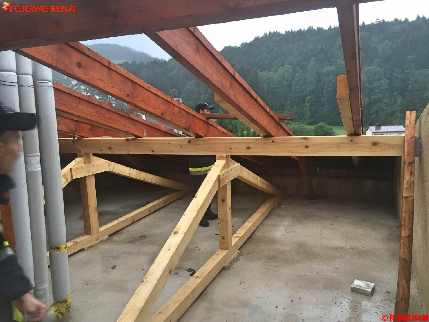 Die Bergrettung Bad Ischl sicherte die Feuerwehrkameraden, welche auf den abgedeckten Dächern im Einsatz stehen.