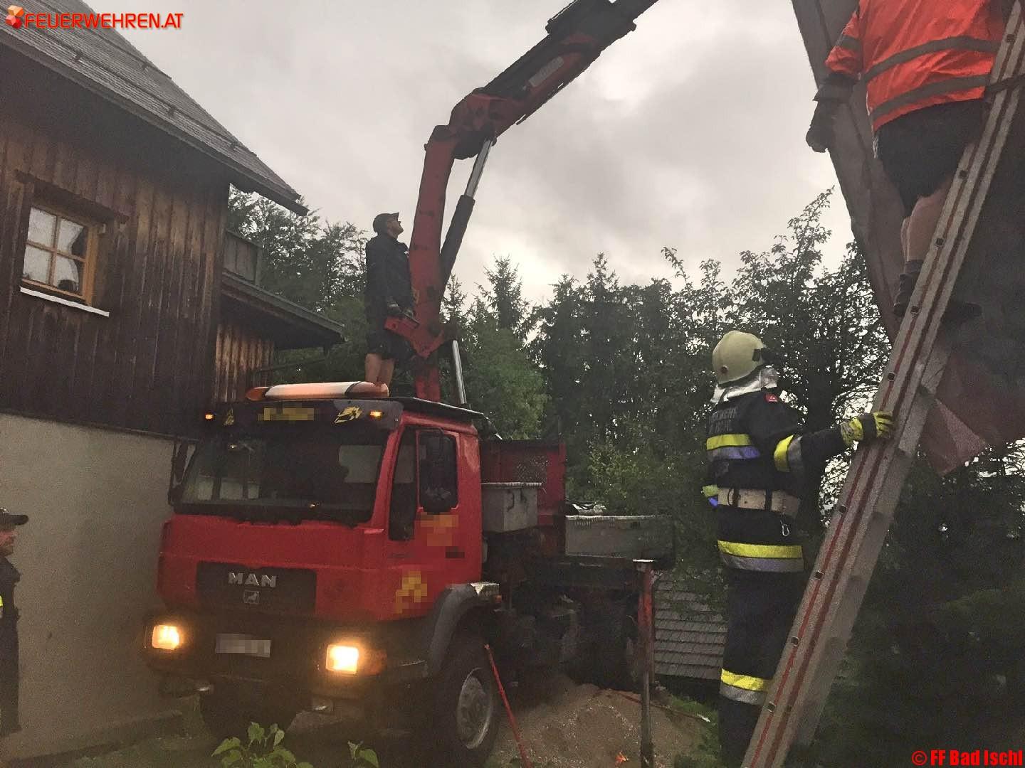 Die freiwillige Feuerwehr Bad Goisern wurde alarmiert, um mit ihrem Hubsteiger die Aufräumungsarbeiten in Bad Ischl zu unterstützen.