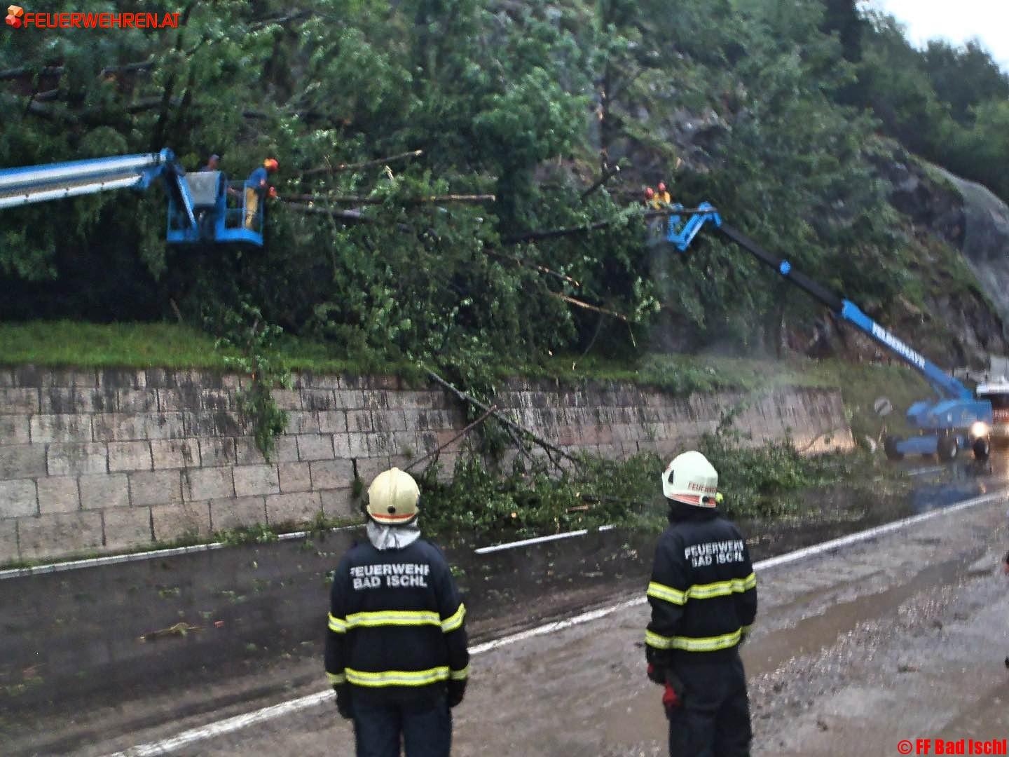 Die freiwillige Feuerwehr Bad Goisern wurde ebenfalls alarmiert, um mit ihrem Hubsteiger die Aufräumungsarbeiten zu unterstützen.