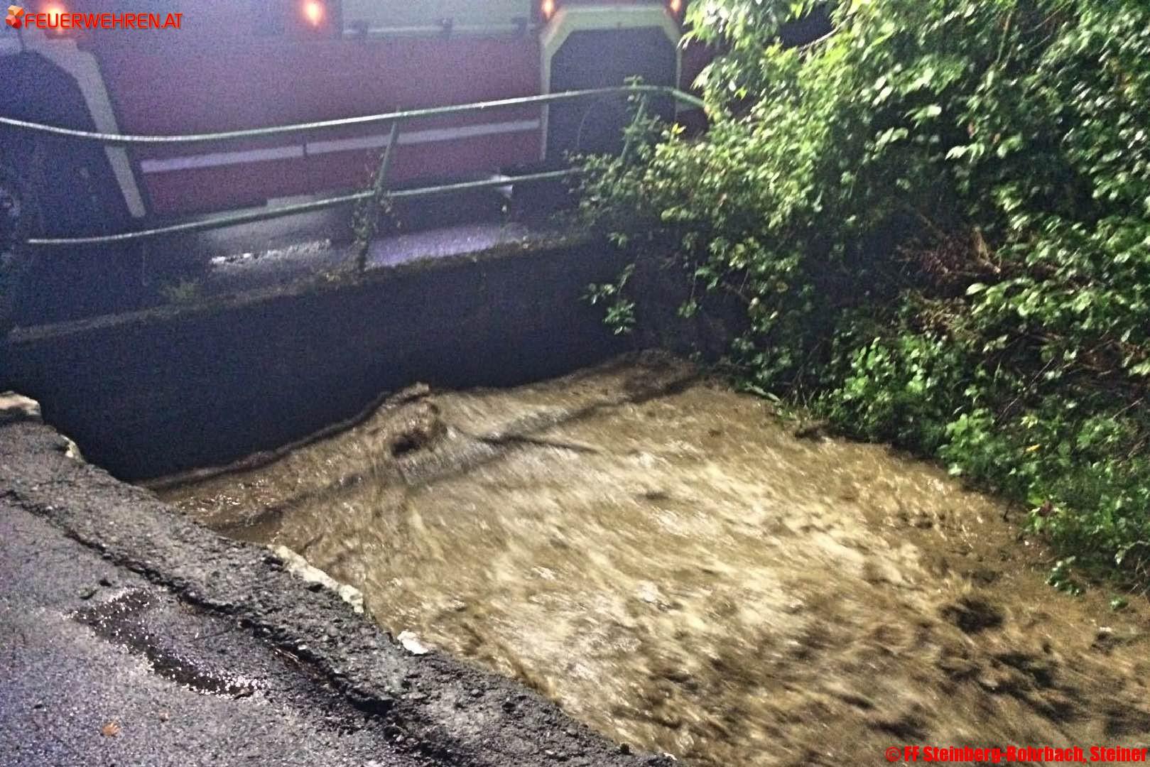 Sieht man in den Ortsteil Steinberg-Rohrbach warf der Gewittersturm auch hier an drei Stellen Bäume um. Die entstandenen Behinderungen konnten aber von den eingesetzten Gruppen rasch behoben werden. Ähnlich wie in St. Oswald waren auch hier der Rohrbach und der Liebochbach an der Grenze, kurz vor dem Überlaufen. Quelle hier ist der Orts-Funkbeauftragte OLM Markus Steiner. Der Ortspressebeauftragte LMdV Christoph Jaritz berichtet ebenfalls von vier Baumbergungen im Ortsteil Berndorf.