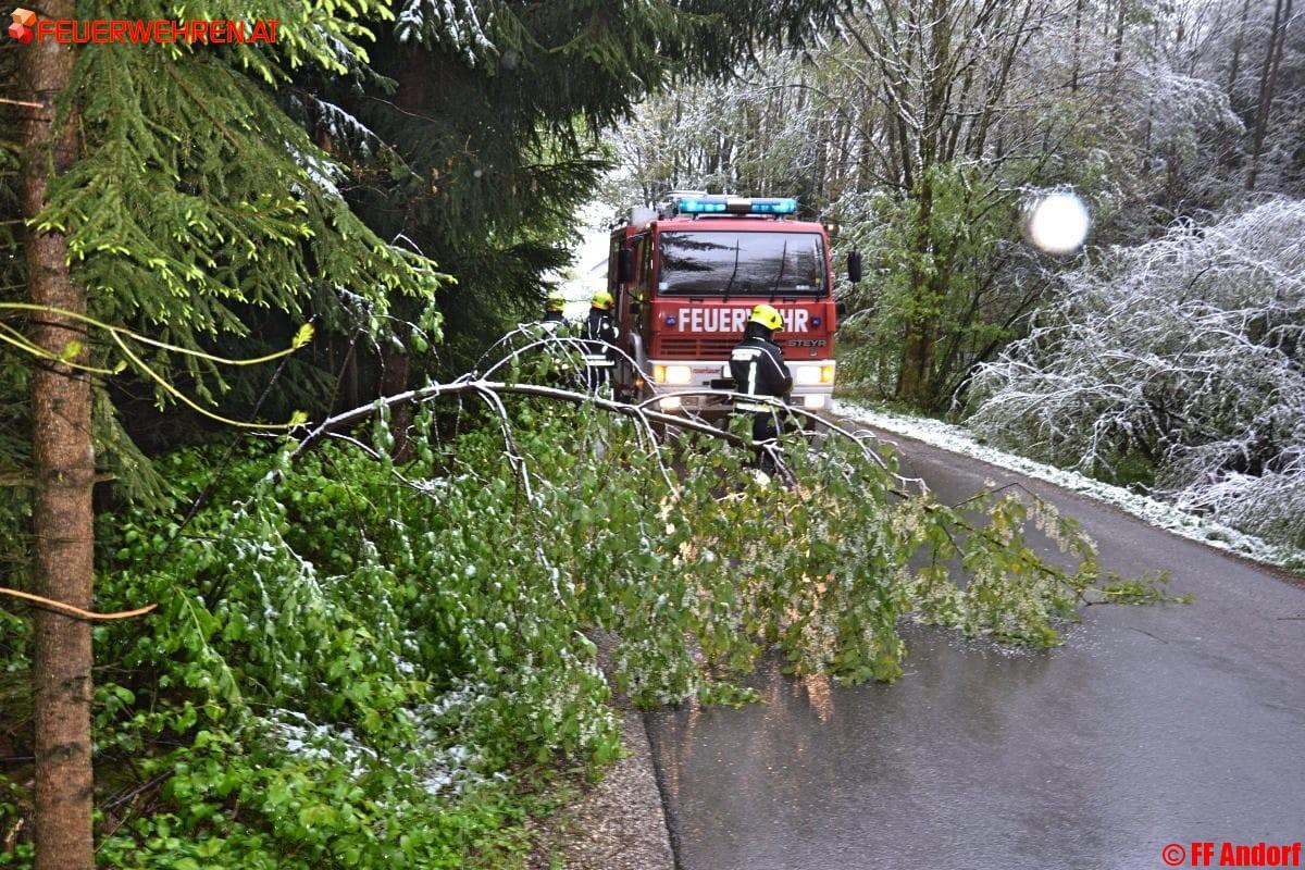 Unter der Last des schweren Schnees knickten zahlreiche Bäume im gesamten Gemeindegebiet um. Manche davon behinderten in der Folge etliche Verkehrswege, denen die Einsatzkräfte der Feuerwehr Andorf mit der Motorsäge zu Leibe rückten, sodass die Straßen für den Verkehr bald wieder passierbar waren.