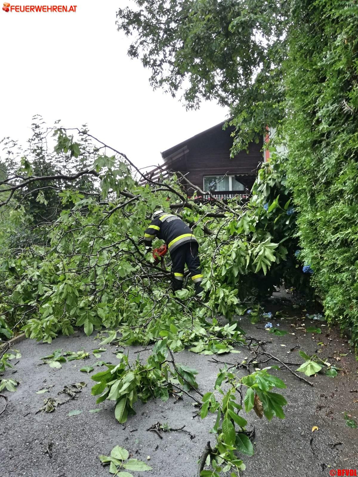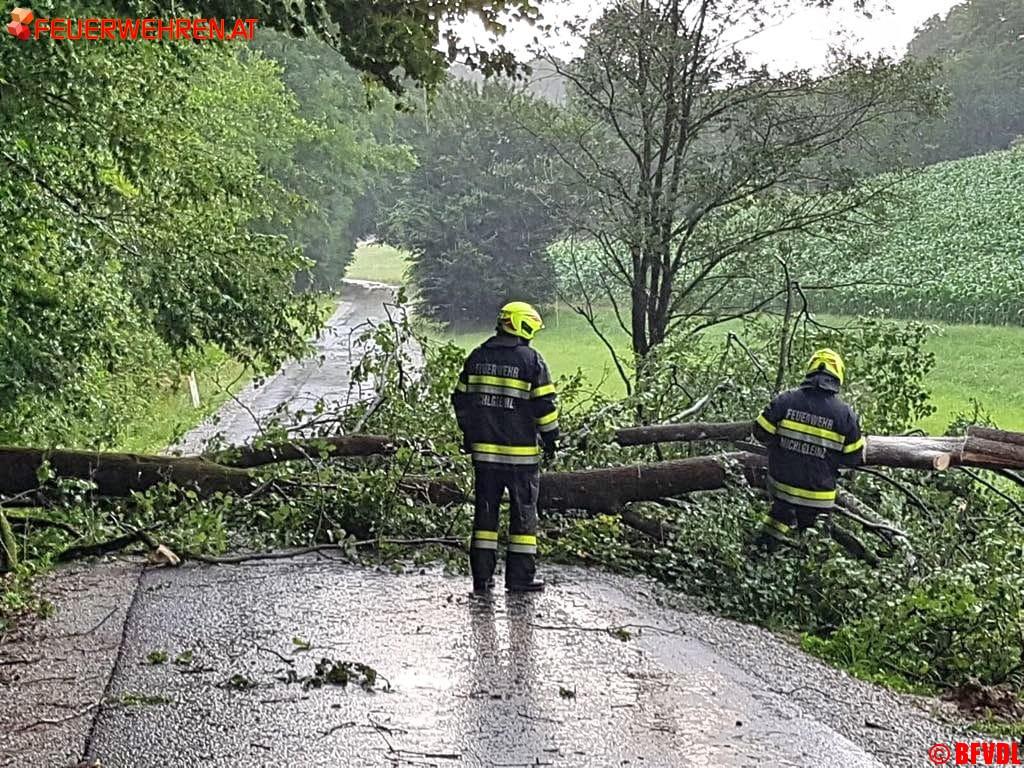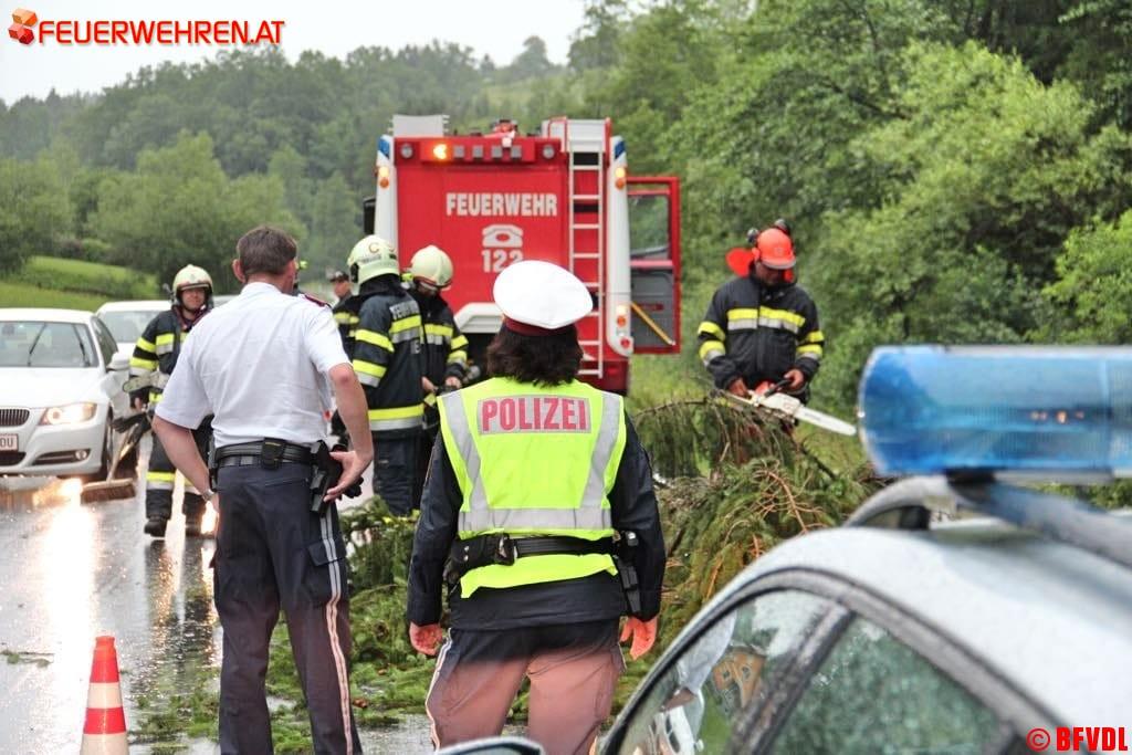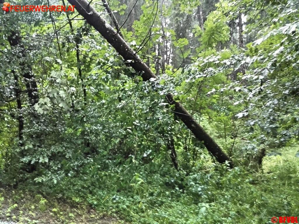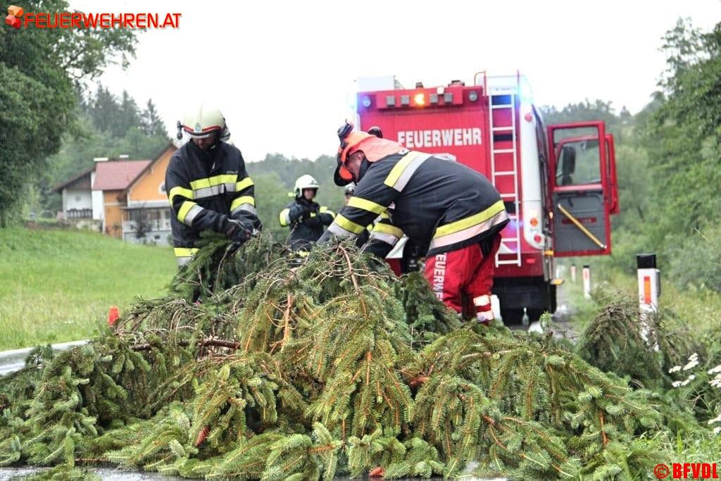 Zahlreiche umgestürzte Bäume, ein abgedecktes Dach in Pölfing Brunn bei der Tennishalle, unter Wasser gesetzte Keller und überflutete Straßen hielten die Freiwilligen Einsatzkräfte des Bereichsfeuerwehrverbandes an diesem Nachmittag auf Trab. Bis 14.30 Uhr liefen 46 Einsätze, 27 Feuerwehren mit 318 Einsatzkräften standen im Einsatz.