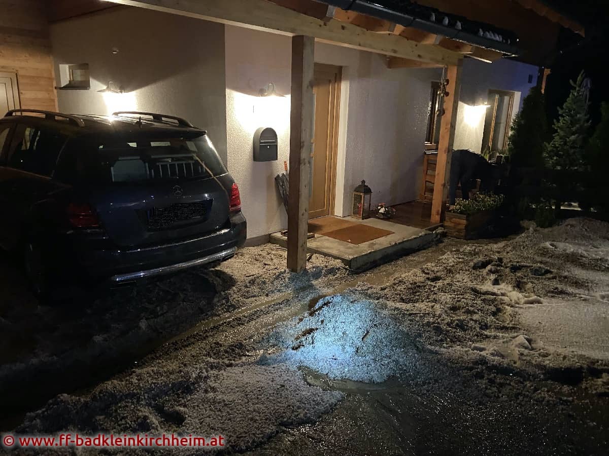 Die Kanalisation sowie einige Bäche konnten die Wassermassen nicht mehr aufnehmen. Die Kameraden pumpten einen Keller in einem Gewerbebetrieb aus und machten Kanalschächte vom Hagel frei.