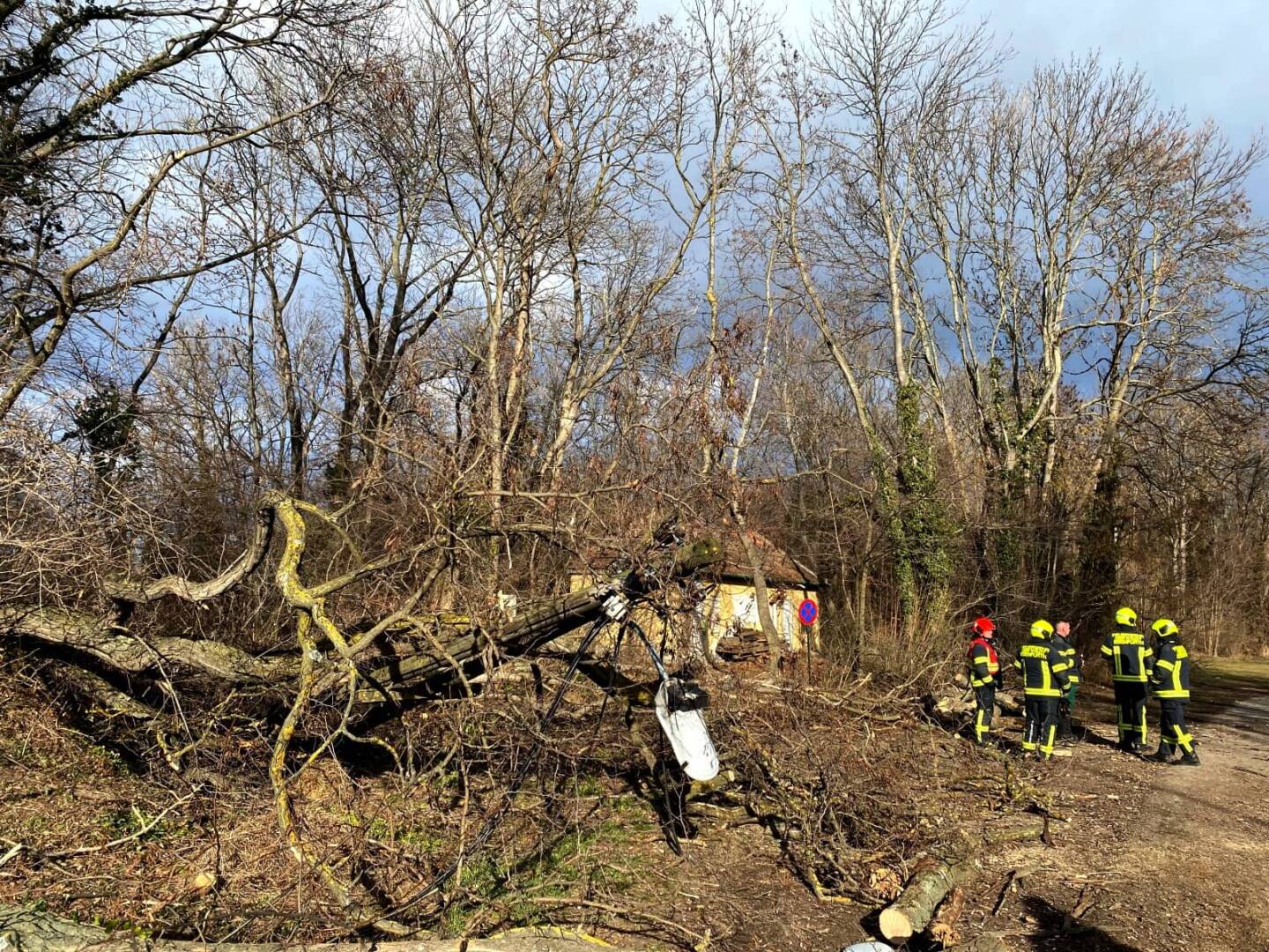 Nach Rücksprache mit dem Energieversorger wurden die Bäume so weit zerkleinert, um die Fahrbahn freigeben zu können. Um ein sicheres Arbeiten zu gewährleisten mussten vor Beginn der Arbeiten noch mehrere Bäume in unmittelbarer Nähe gezielt gefällt werden.