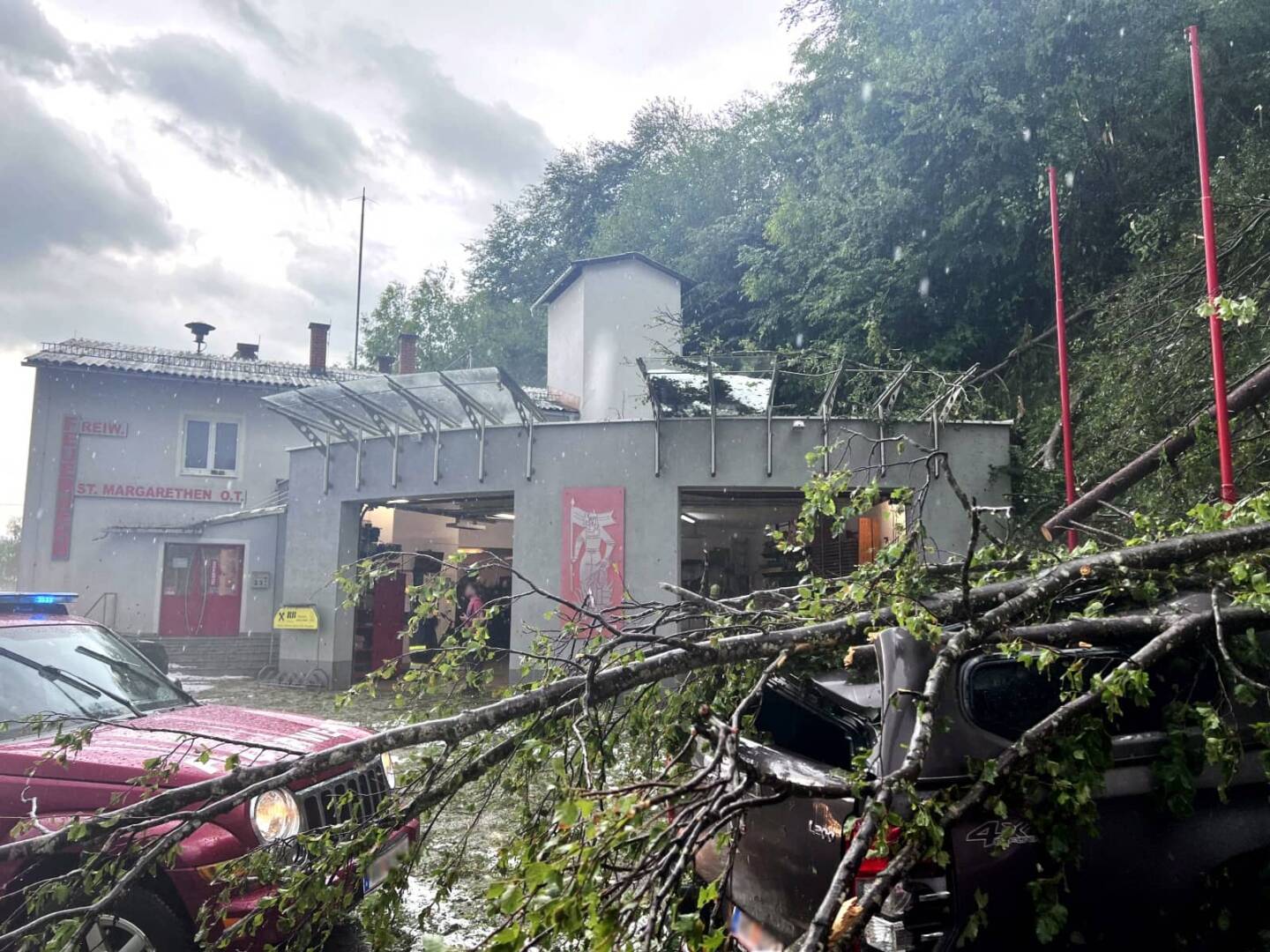 Die Einsatzliste reicht von Bäumen über Straßen, Keller unter Wasser, Vermurungen und Überschwemmungen bis hin zu vom Hagel zerstörte Dächer. Ebenso das Feuerwehrhaus der Feuerwehr St. Margarethen ob Töllerberg wurde durch das Unwetter stark zerstört.