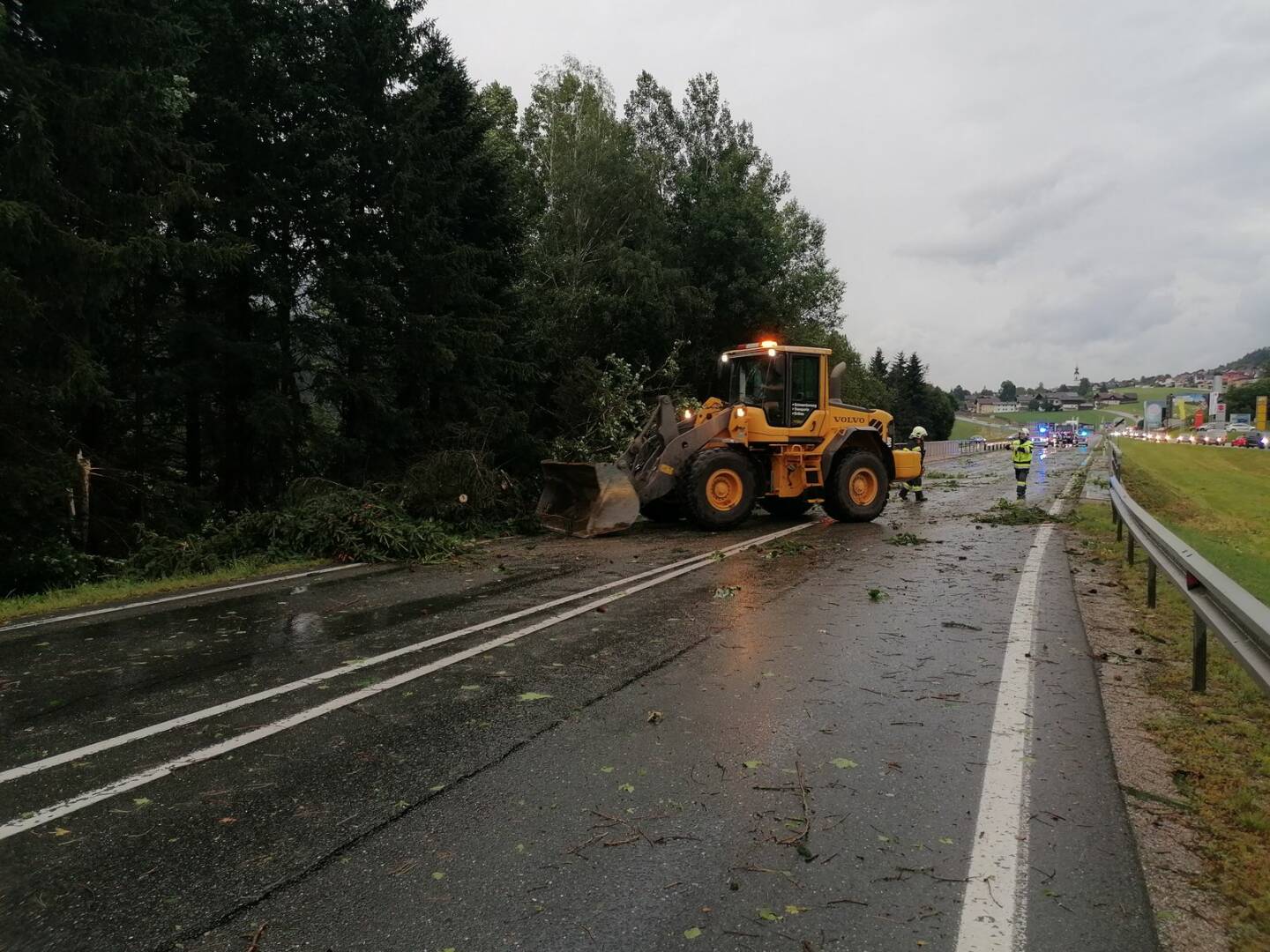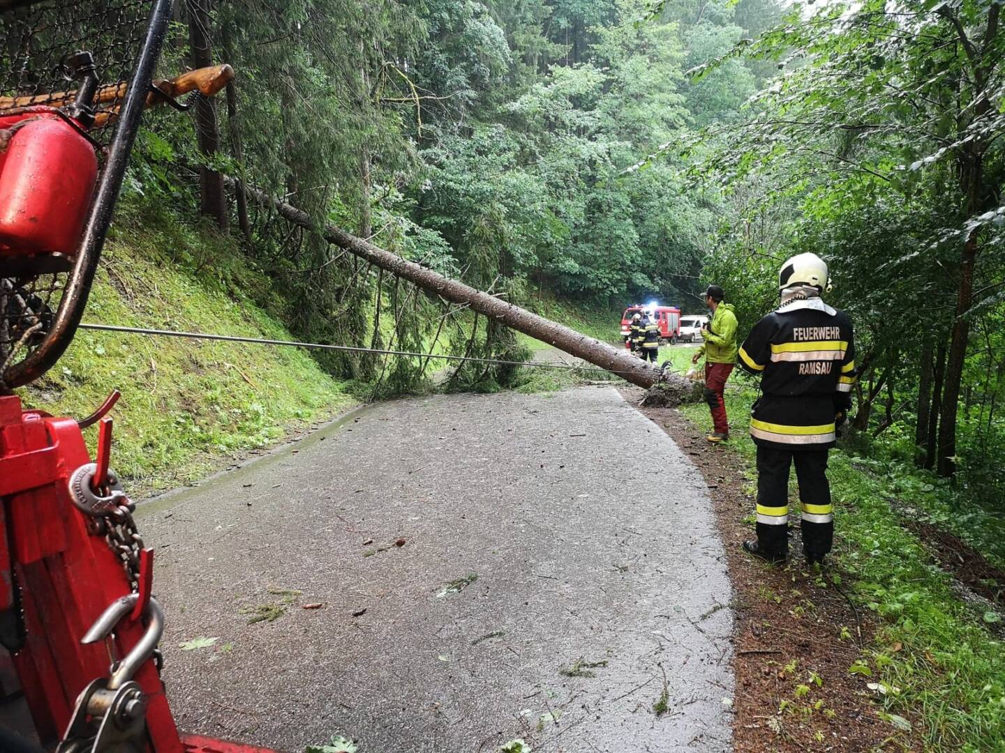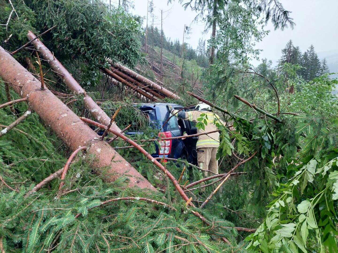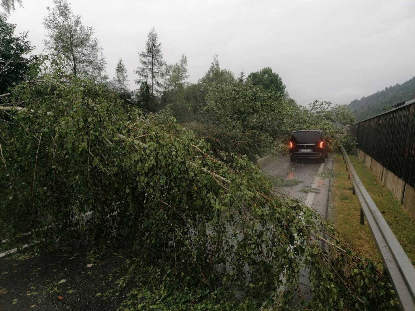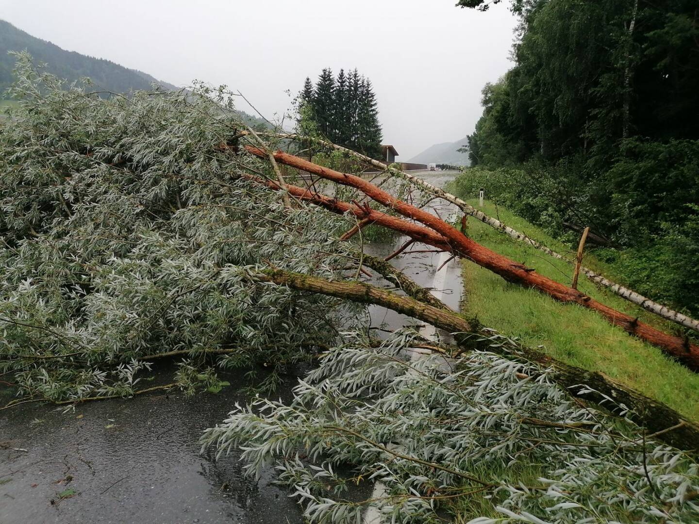 Auch am heutigen Tage fegte eine Unwetterfront über das Ennstal, alleine die B320 war massiv von umgestürzten Bäumen betroffen. Weite Abschnitte der Ennstalbundesstraße waren für die Dauer der Aufräumarbeiten komplett gesperrt. Hotspots waren dabei Mandling, Schladming, Oberhaus, Haus, Ruperting, Gröbming und Stainach; alleine zwischen Schladming und Haus im Ennstal stürzten im dreispurigen Abschnitt rund zwei Dutzend ausgewachsener Bäume auf die Straße, wie durch ein Wunder wurde kein Fahrzeug getroffen.