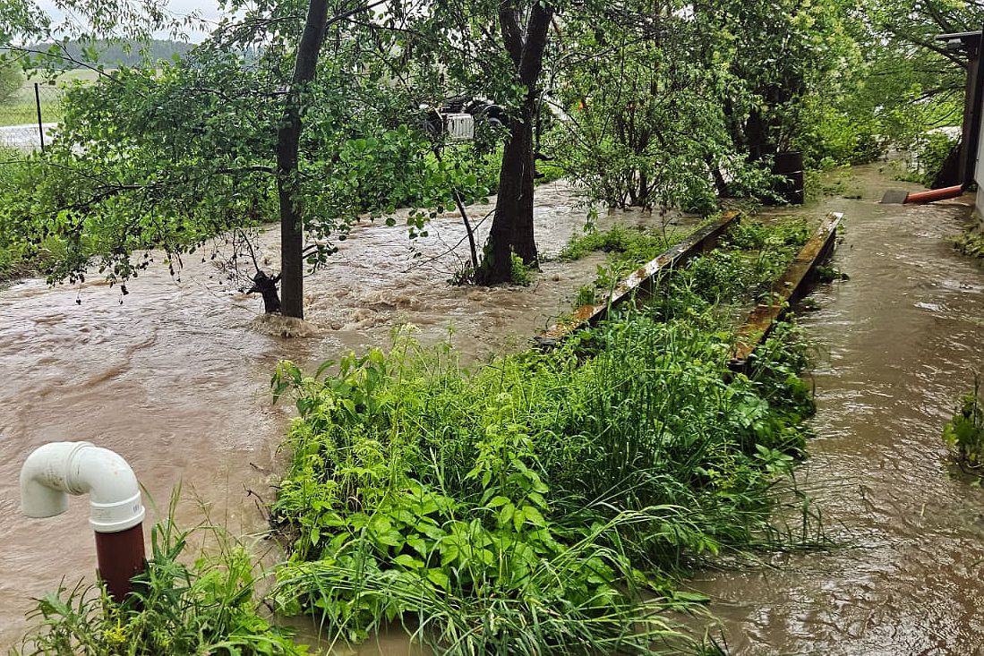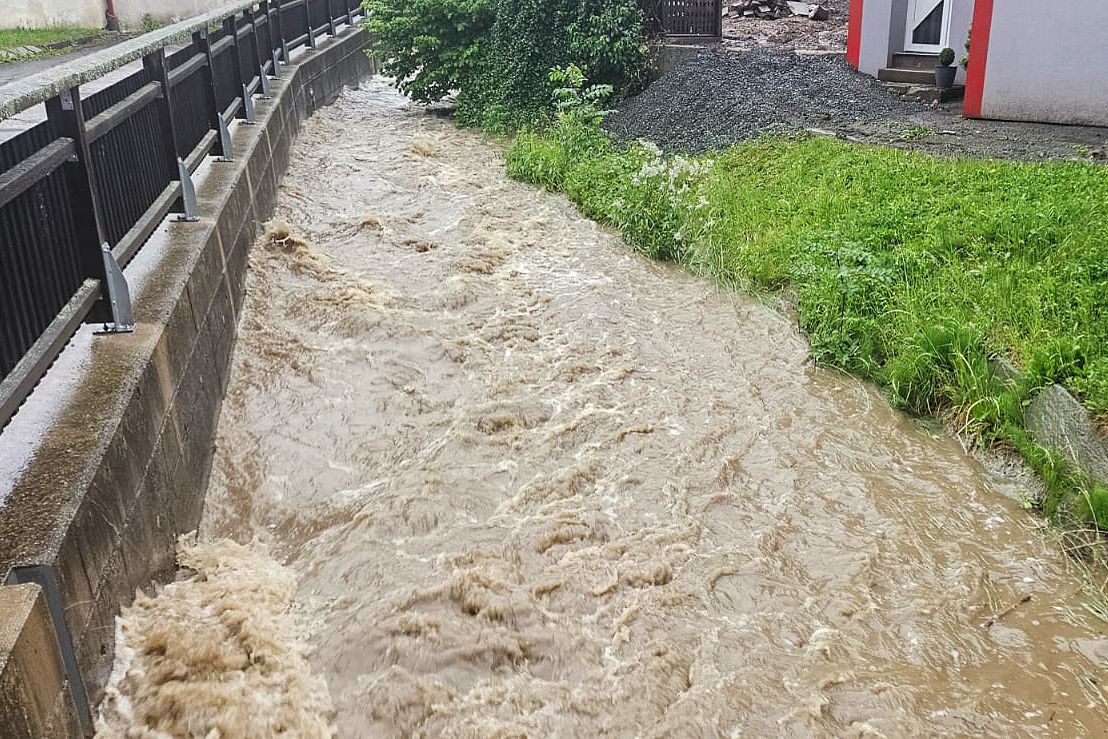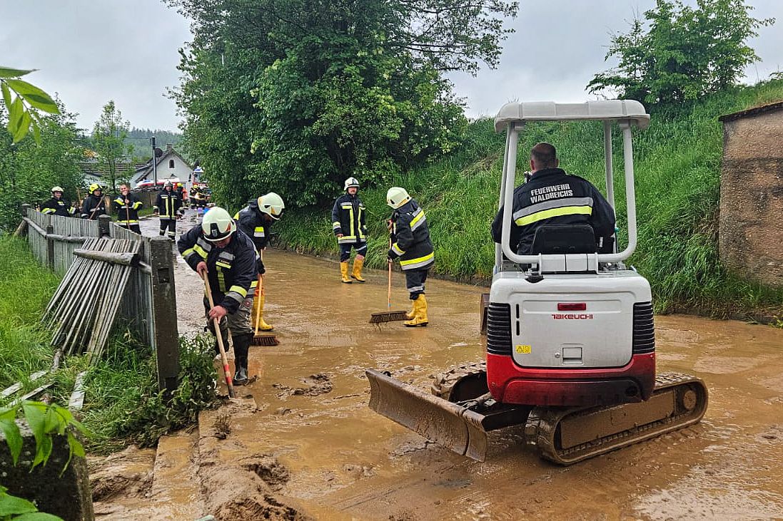 Überflutete Keller und vermurte Straßen brachte ein Starkregenereignis am Dienstagnachmittag. In mehreren Gemeinden standen 128 Feuerwehrmitglieder bei Auspump-, Reinigungs- und Sicherungsarbeiten im Einsatz.