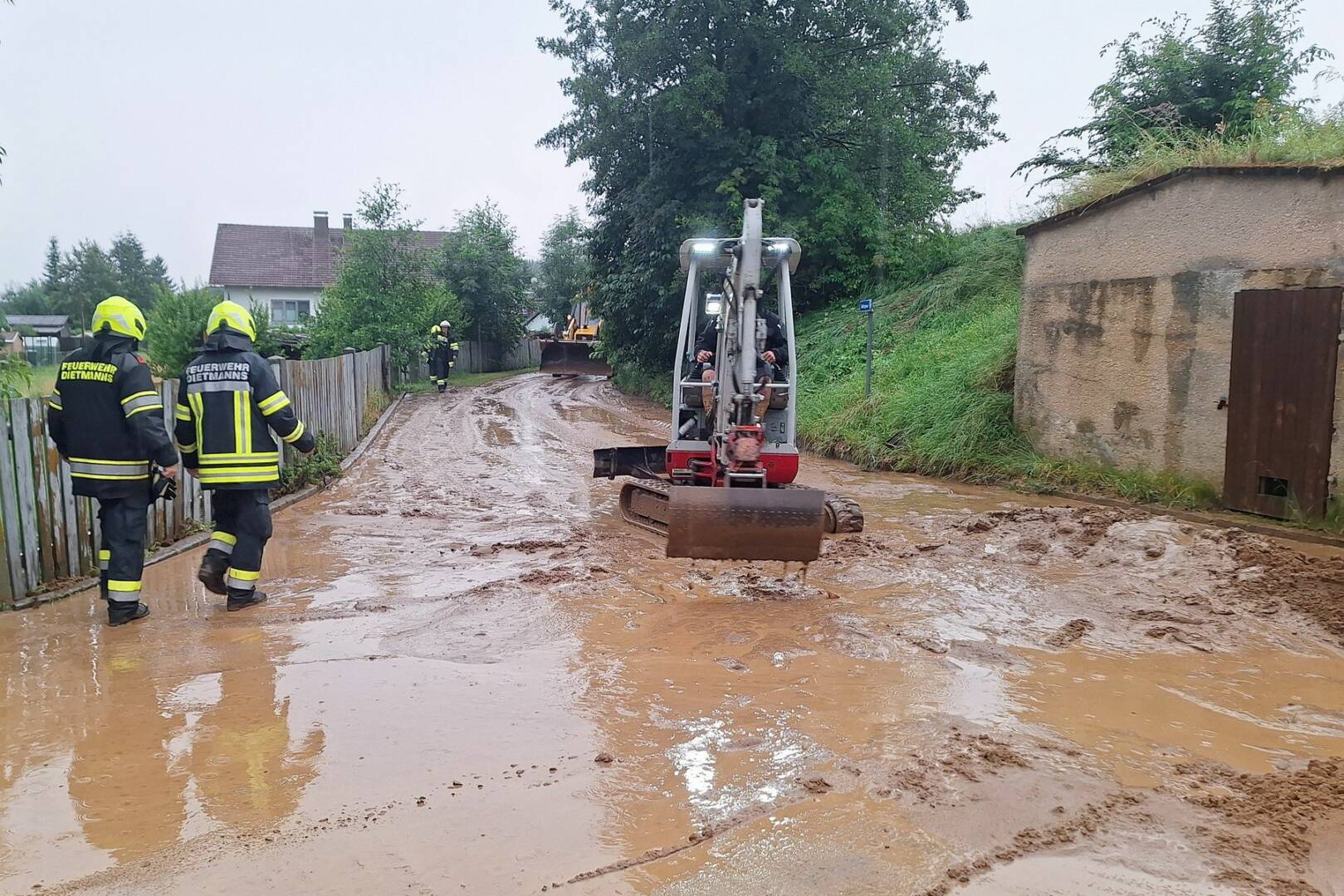 Rund eine Stunde später traf eine weitere Gewitterfront die Gemeinden Dietmanns und Groß-Siegharts. Wie schon Ende Mai setzte der starke Regenfall die Kellergasse unter Wasser. In zwei Wohnhäuser drang Wasser ein und wurde von den Einsatzkräften ausgepumpt. In der Kellergasse beseitigten die Einsatzkräfte den Schlamm mit Hilfe von zwei Baggern. Die Feuerwehren Matzles, Ulrichschlag, Waldreichs, Waidhofen/Thaya und Wienings unterstützen die örtliche Feuerwehr Dietmanns bei den Aufräumarbeiten. 47 Mitglieder standen im Einsatz.