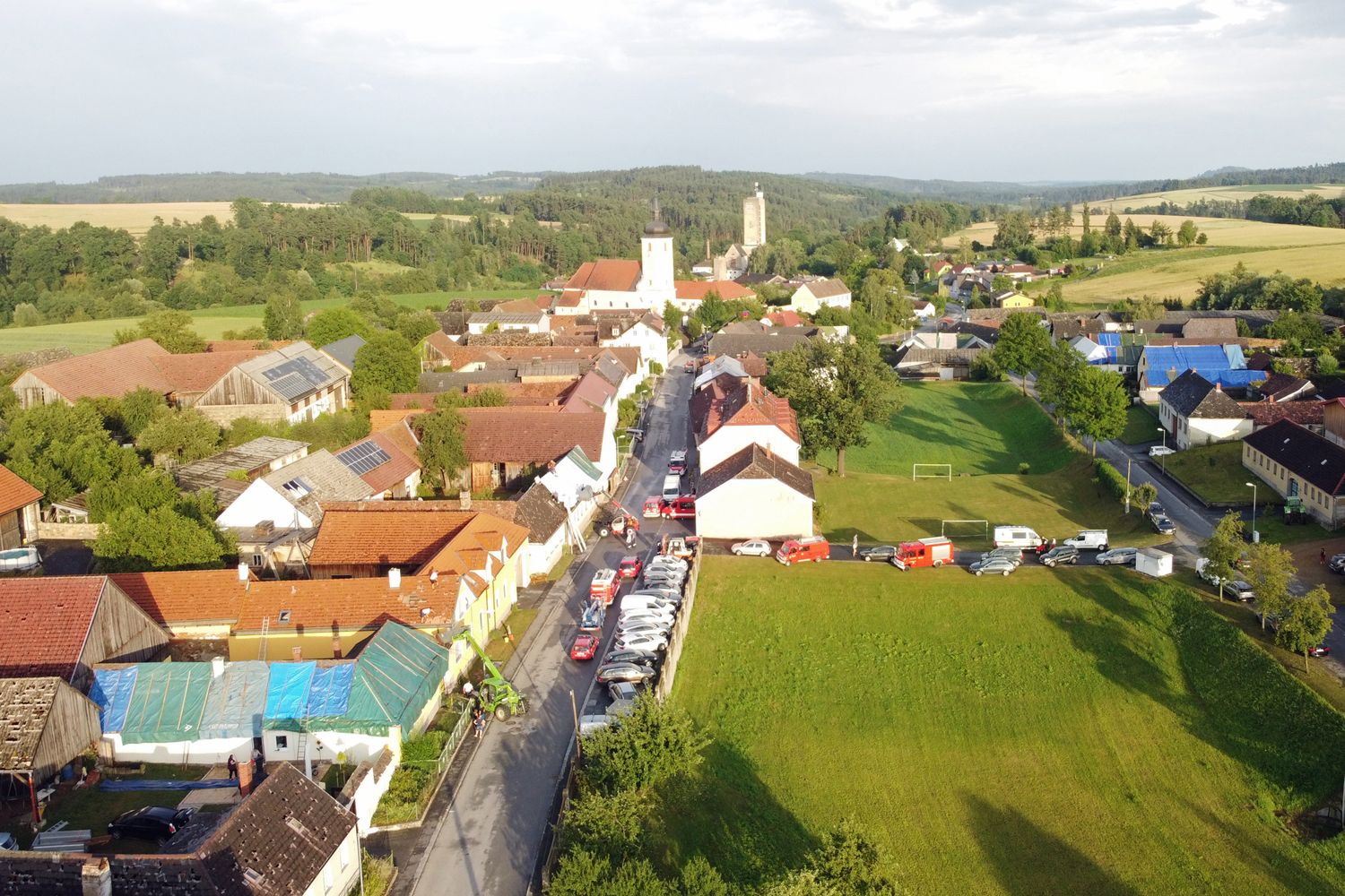 Bis 21:00 Uhr standen über 250 Feuerwehrmitglieder aus den Bezirken Waidhofen an der Thaya, Gmünd und Zwettl im Einsatz, um mit Planen die beschädigten Gebäude provisorisch abzudecken. Auch während einem weiteren Gewitterschauer mit Starkregen wurden die Arbeiten weitergeführt.