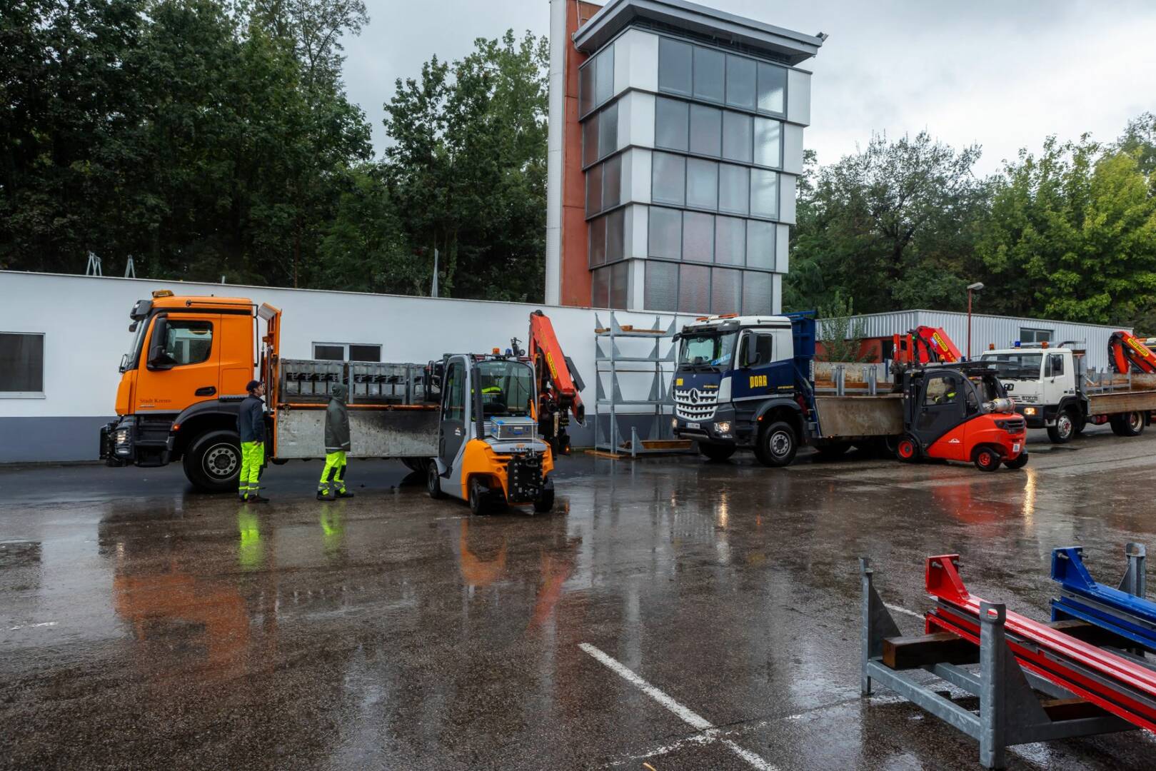 Am morgigen Sonntag werden in Langenlois und Hadersdorf vier KHD-Züge im Einsatz sein. Dort werden auf einer Gesamtlänge von 1.800 Metern mobile Flutsperren (Mose-System) errichtet, um die betroffenen Gebiete vor Überschwemmungen zu schützen. Um die Flutsperren mit Schotter oder Sand zu befüllen, stehen 14 Betonmischwagen zur Verfügung.