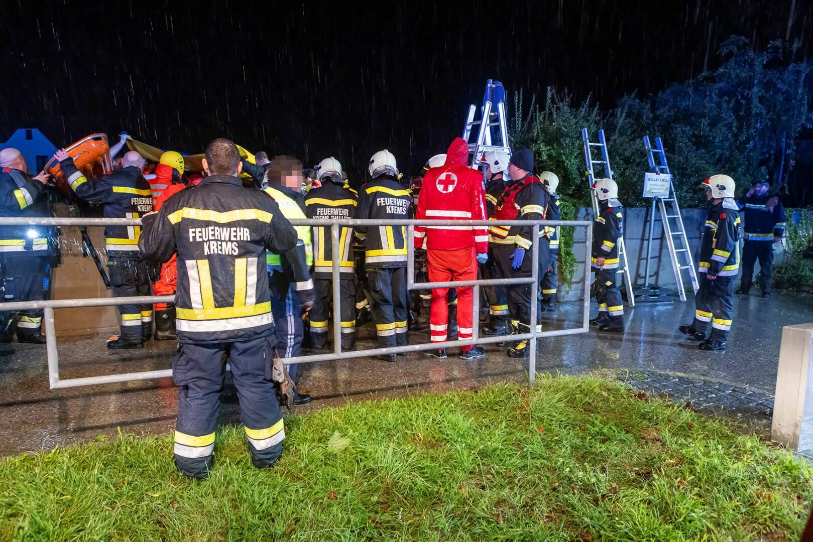Mit Steckleitern wurden Überstiegshilfen erreichtet, mit Planen wurde für einen Regenschutz gesorgt. Außerdem leuchtete die Feuerwehr den Einsatzbereich aus und unterstützte das Rote Kreuz bei der Versorgung des Patienten. Nachdem der Rollstuhlfahrer rasch in den Rettungstransportwagen gebracht werden konnte, wurde dieser ins Krankenhaus Krems gebracht.