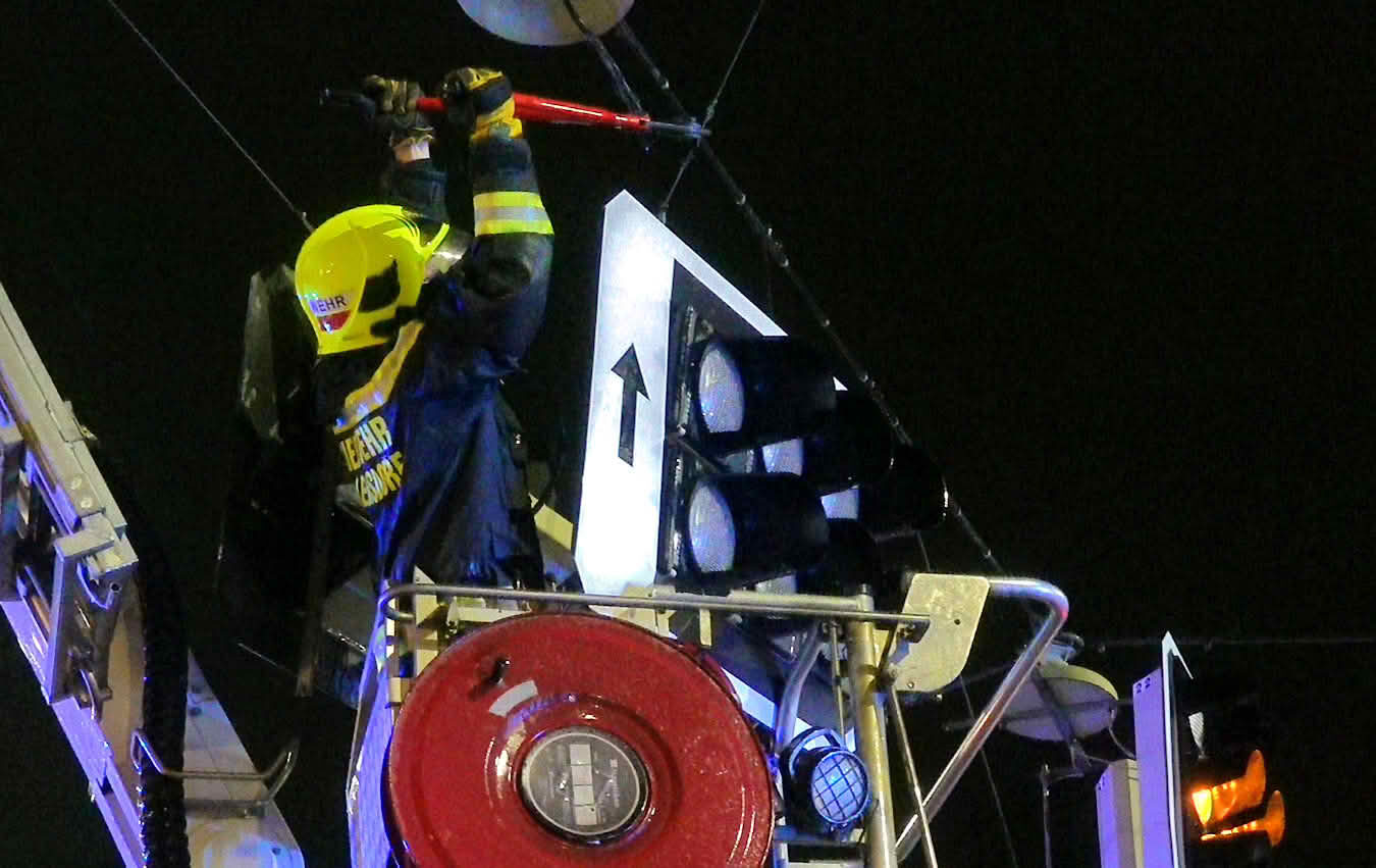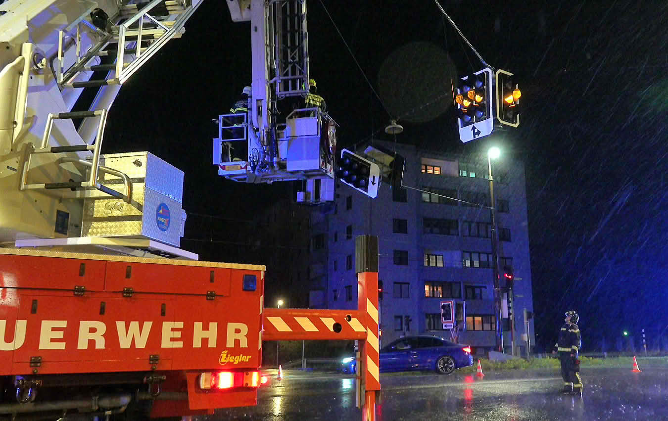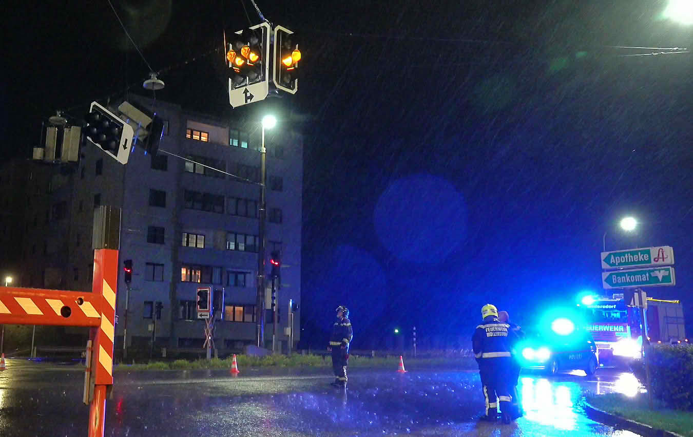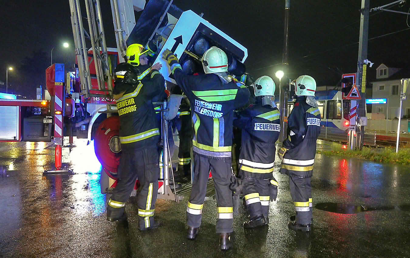 Zweimal hieß es bislang dann für die Freiwillige Feuerwehr Möllersdorf zur Gefahrenabwehr auszurücken. Bei der ersten Alarmierung um 19.30h kam von der Feuerwehrbereichsalarmzentrale BADEN die Zusatzmeldung „Baustellenklo fliegt herum“. Um 19.42 Uhr erhielten sie bereits die nächste Meldung. Auf der B17 hielt die Abspannung einer Verkehrsampel den heftigen Sturmböen nicht stand. Die Sicherungsarbeiten der FF Möllersdorf wurden durch die Teleskopmastbühne der FF Traiskirchen-Stadt unterstützt. Eine Polizeistreife leitete währenddessen den Verkehr um.