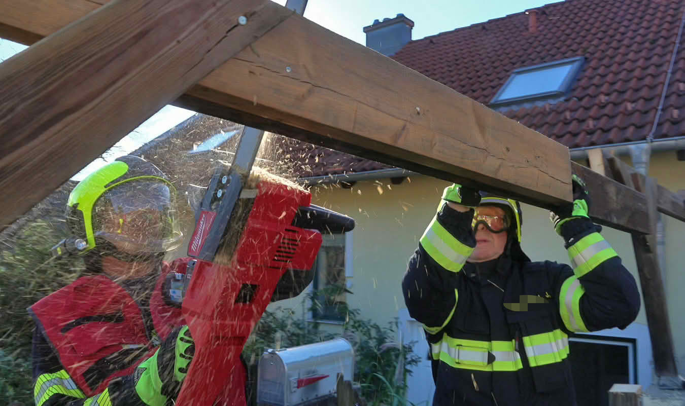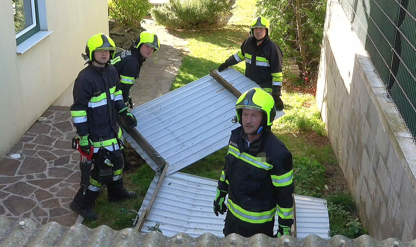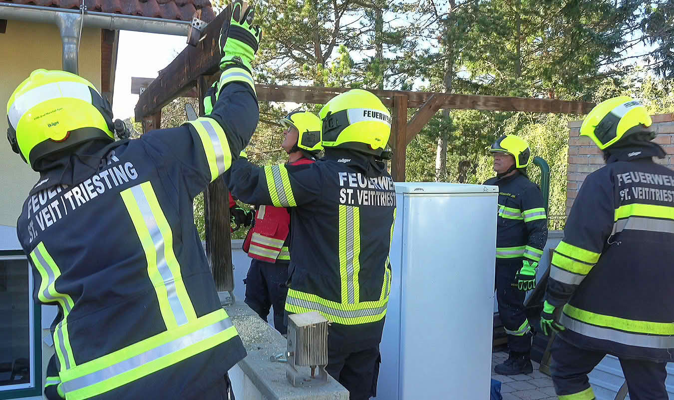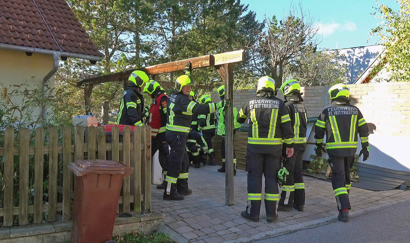 Um 09.26 Uhr wurde die Freiwillige Feuerwehr St.Veit a.d.Triesting von der Feuerwehr Bereichsalarmzentrale BADEN zu einem Sturmeinsatz alarmiert. Ein Carport hielt den starken Windböen nicht stand. Mehrere Teile wurden in den Garten und auf die Straße geweht. Mühsam galt es die Blechteile und die beschädigte Holzkonstruktion zu entfernen.
