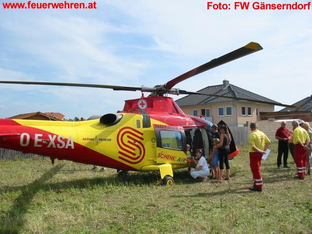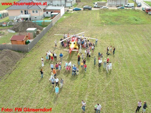 Kurz darauf traf, aufgrund eines Verkehrsunfalls etwas verspätet, die Hauptattraktion des Nachmittags ein. Robin 5 landete unweit vom RK-Gelände in einem angrenzenden Feld und konnte von den Besuchern bestaunt werden.
