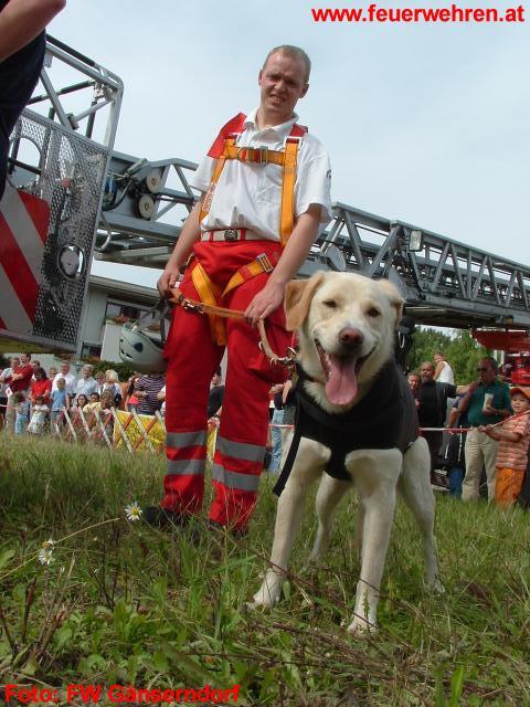 Ein Highlight des Nachmittags war eine Vorführung gemeinsam mit der Suchhundestaffel des RK. Ein Rettungsteam, bestehend aus Hundeführer und seinem Suchhund wurden vom Korb der Drehleiter Gänserndorf aus abgeseilt.