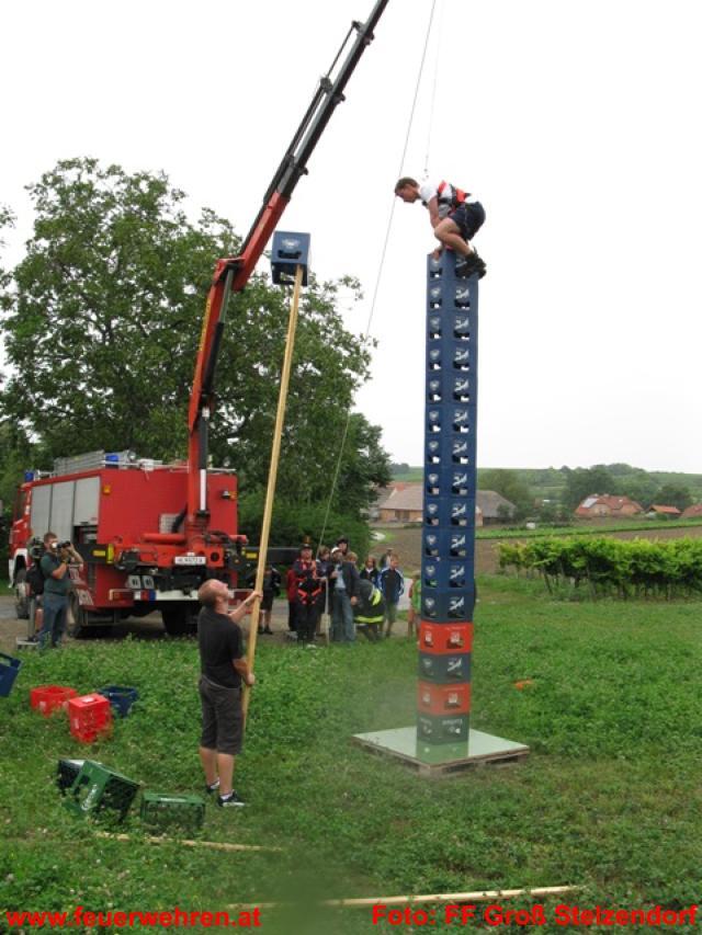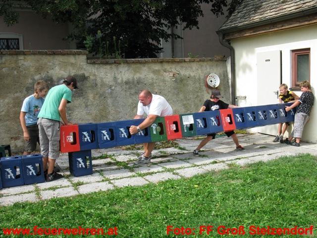 Am Samstag nach einem guten Frühstück begleitet auch heute wieder der Lagersechskampf die Feuerwehrjugendgruppen durch den Tag. Die Aufgabe bei der vierten Station war soviele leere Bierkisten wie möglich waagrecht an eine Wand zu drücken, natürlich durften diese den Fußboden nicht berühren.