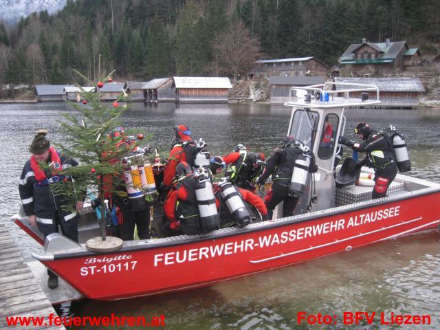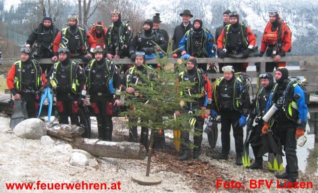 Beim sogenannten Weihnachtstauchgang, zugleich die zweite Bezirkstauchübung des Feuerwehrbezirkes Liezen, konnte der Bezirksbeauftragte OBI Schröttenhammer Andreas auch das erste Mal Kameraden aus Oberösterreich begrüssen. Mitglieder der Wasserrettung Attersee und Ebensee kamen zum Gegenbesuch nach Altaussee, um gemeinsam mit den Mitgliedern der Wasserdienststützpunkte Altaussee, Au bei Gaishorn, Grundlsee, Gössl und Rottenmann das Jahr 2009 ausklingen zu lassen. Bei angenehmen Winterwetter (Wassertemperatur 6 Grad) versenkten 16 Taucher traditionell den Weihnachtsbaum und bedankten sich so für ein unfallfreies Jahr.
