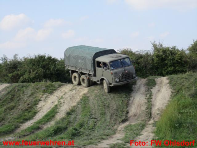 Die letzte Bewerbsstrecke führte uns zum „Defender an der Leine“. Dabei wurde ein Defender im ersten Gang ohne Besatzung nur mit zwei Leinen durch eine Strecke gefahren. Dabei zählte wieder die Teamarbeit. Hier zeigte sich wieder die super Zusammenarbeit der Ohlsdorfer Feuerwehrmänner, welche sich den dritten Platz bei dieser Station sicherten. Als Fun-Station wurden die Teilnehmer in einem alten Bundesheer Lkw Steyr 680 durch das Gelände chauffiert.