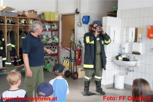 Alle Hände voll zu tun hatten die Ohlsdorfer Feuerwehrmänner am Mittwoch, den 13. Juli 2011, als ein ganzer Kindergarten zu Besuch kam. Pünktlich um 08:00 Uhr kam die erste Hälfte des Kindergartens II (Wöhrerstraße) zur FF Ohlsdorf. Aufgeteilt auf zwei Gruppen wurde mit den Feuerwehrfahrzeugen eine Runde durch Ohlsdorf gedreht. Die jeweils zweite Gruppe wurde von Kameraden im Gerätehaus empfangen und die Feuerwehr nähergebracht.