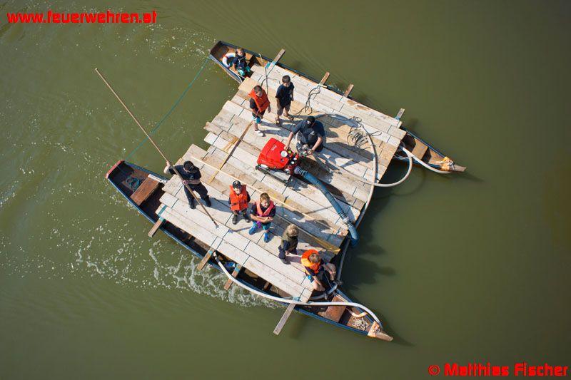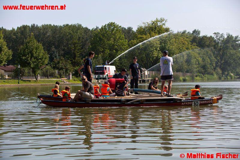 Bei der 2. Station (Feuerwehr Sitzenberg) war das Fahren mit einem Floß (bestehend aus 2 Zillen, angetrieben von einer Tragkraftspritze) eine neue Erfahrung für die Kinder.