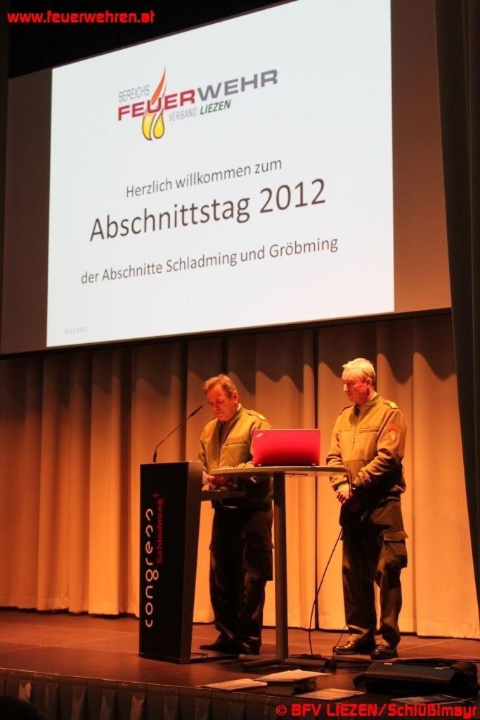 Am Freitag (23.11.2012) hielten die beiden westlichsten Feuerwehrabschnitte des Bezirkes Liezen ihren diesjährigen Abschnittstag ab und zwar erstmalig gemeinsam. Ein Pilotprojekt, zu dem Bereichskommandant-Stv. BR Heinz Hartl in seinen Grußworten den beiden Abschnittskommandanten ABI Gerd Bartl (Gröbming) und ABI Johann Lettner (Schladming) gratulierte und dankte.