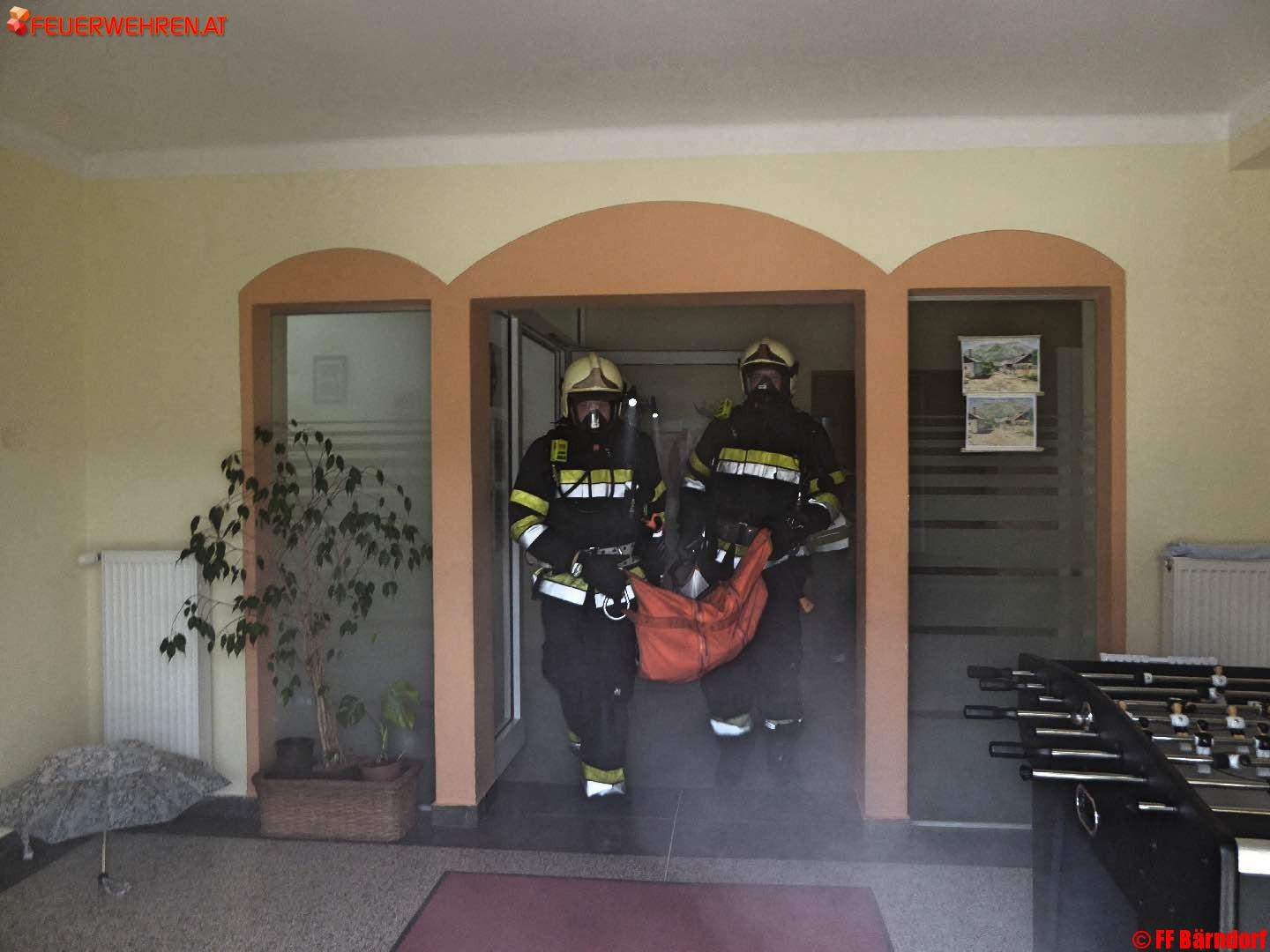 Als Übungsgebäude diente die örtliche Volksschule, als Übungsannahme musste von den Wehren jeweils eine „vermisste“ Person in den verrauchten Klassenzimmern aufgefunden und gerettet werden.