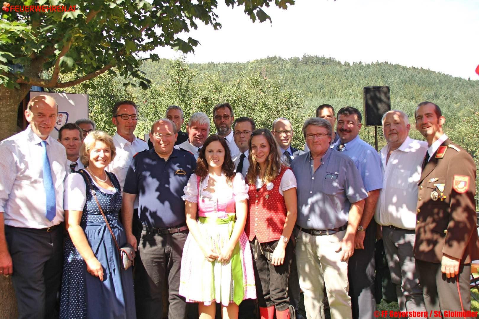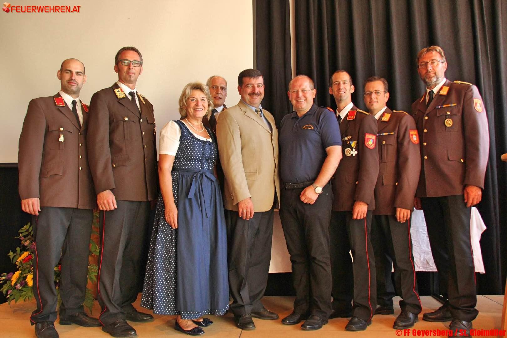 Geyersberger Kameraden feiern neues Feuerwehrhaus; von links: Kommandantstellvertreter Ing. Matthias Schmotz, Bezirksfeuerwehrkommandant Martin Boyer, wirklicher Hofrat Dr. Elfriede Mayrhofer, Willy Konrath BSC, Landtagsabgeordneter Johann Edlinger, Bürgermeister Mag. Roman Janacek, Kommandant Werner Wieländer, Abschnittskommandant Stv. Johannes Lechner, Abschnittskommandant Herbert Bagl