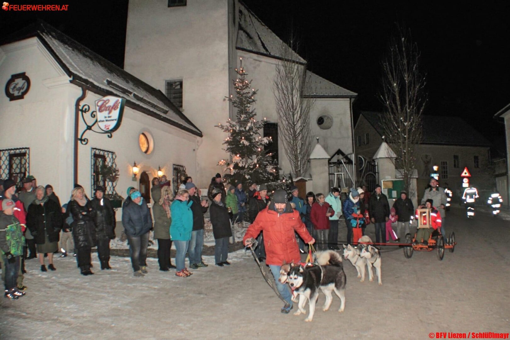 Die Feuerwehrjugend überreichte das Friedenslicht an LBDS Gerhard Pötsch, welches zuvor mit einem Hundeschlittengespann am Dorfplatz vor der Kirche eingetroffen war.