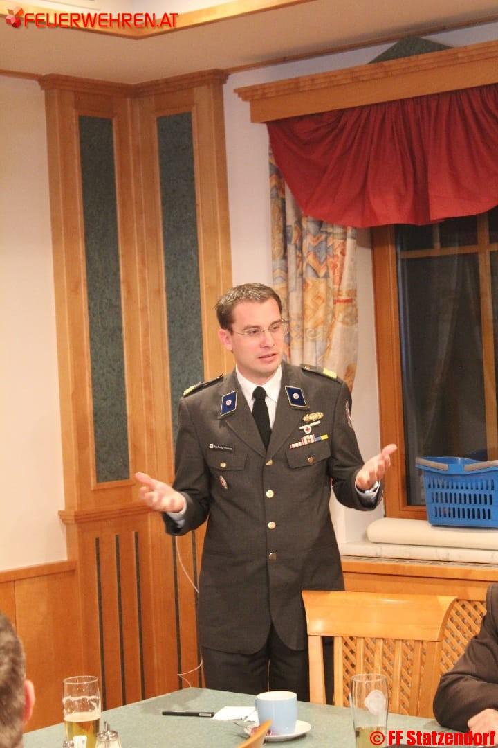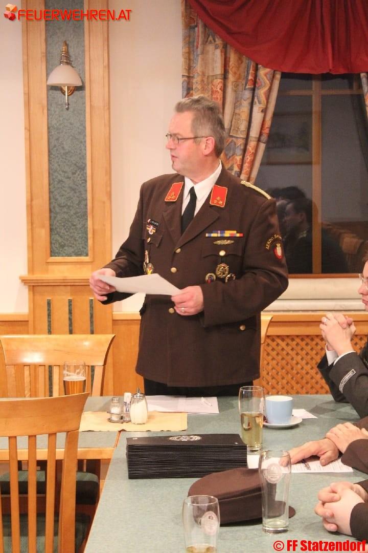 Bürgermeister Stellvertreter Wolfgang Steininger würdigte in seinen Ausführungen die freiwillige und professionelle Arbeit der Freiwilligen Feuerwehr Statzendorf und wünscht für das zukünftige Arbeitsjahr alles Gute. Der Bezirksstellenleiter des Roten Kreuzes Mag. Michael Prunbauer lobte die gute Zusammenarbeit bei Übungen und Einsätzen und stellte kurz die Leistungsbereiche innerhalb des Roten Kreuzes vor. Brandrat Walter Czech und Hauptbrandinspektor Johann Schuster informierten über Neuigkeiten auf Abschnitts- und Unterabschnittsebene.