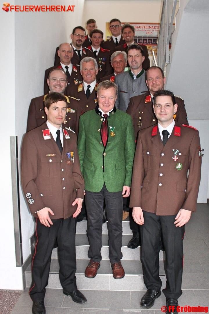 Als letzte „Amtshandlung“ führte der scheidende Kommandant gemeinsam mit Bgm. Guggi und LAbg. Royer die Ehrung verdienter Kameraden durch, allen voran HBIaD Hannes Mayerl für 40-jährige und Bgm. Lois Guggi sowie Johann Hörmann für 50-jährige Tätigkeit auf dem Gebiete des Feuerwehrwesens. Der Hüttenwart und ehemalige Maschinenmeister OBM Herbert Schmid erhielt das Verdienstzeichen in Silber (Foto).