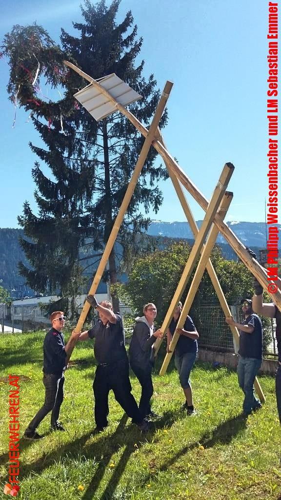 Bei traumhaften Wetter und begleitet von zünftigen Ziehharmonikaklängen wurde der Maibaum in traditioneller Art und Weise von wackeren Burschen errichtet. Als Maibaummannschaft fungierten die Zivildiener und freiwilligen Disponenten der Bereichswarnzentrale „Florian Liezen“, unterstützt von Bereichskdt-Stv. BR Heinz Hartl, AFK Abs. Liezen ABI Reinhold Binder, Kantineur LM Konrad Gollmayr, Dienststellenleiter LM Philipp Weissenbacher und dem Kommando der FF Pyhrn.
