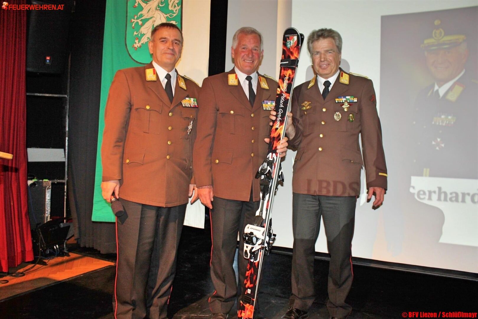 OBR Heinz Hartl und BR Reinhold Binder dankten dem ehem. Bereichsfeuerwehrkommandanten LBDSaD Gerhard Pötsch für seine Verdienste um den Bezirk und überreichten dem Feuerwehrjungpensionisten im Namen aller Kameraden als Geschenk ein Paar Atomic-Carvingski mit feuriger Sonderlackierung, worüber sich der Beschenkte sichtlich freute.