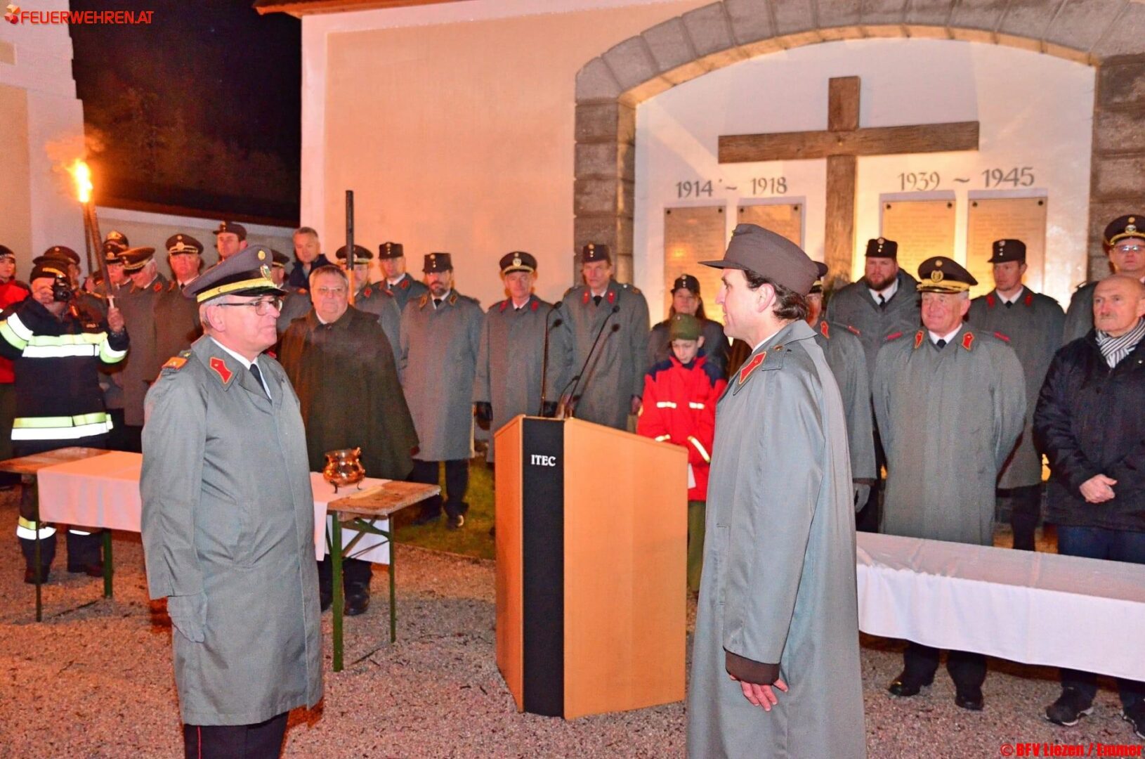 Die Feuerwehrjugend des Abschnittes Irdning überreichte das Friedenslicht an OBR Hartl und Pfarrer Prochazka. Der Pfarrer mahnte, vor dem Mahnmal der beiden Weltkriege, alle Anwesenden, sich für Zusammenhalt und Frieden einzusetzen.