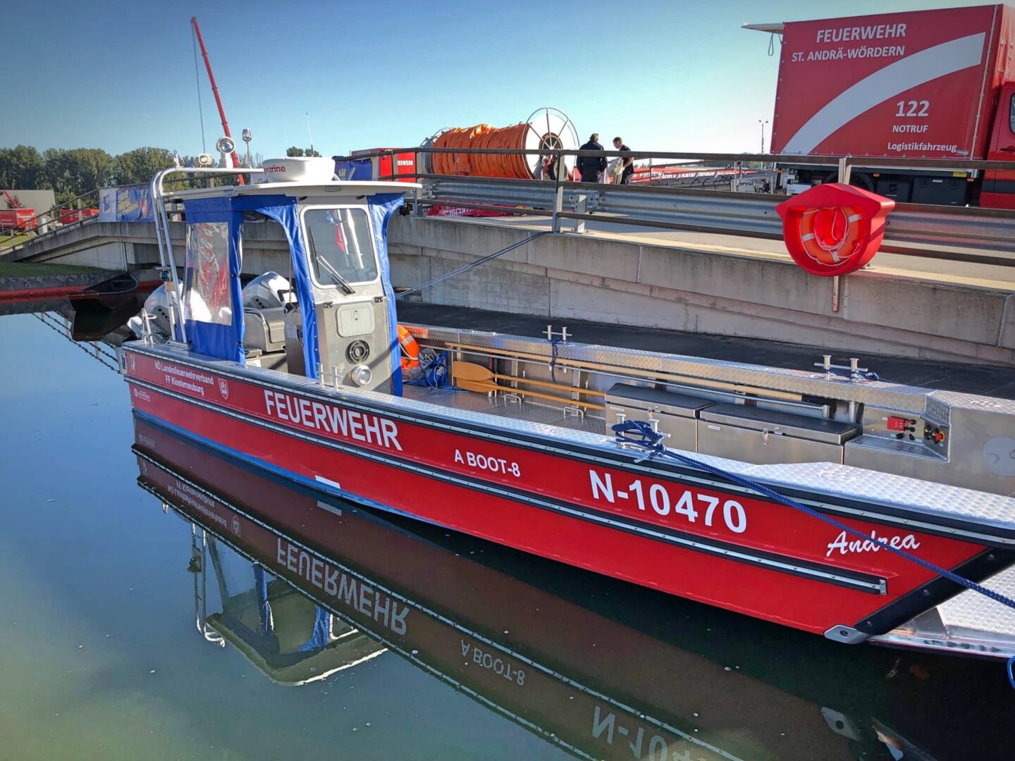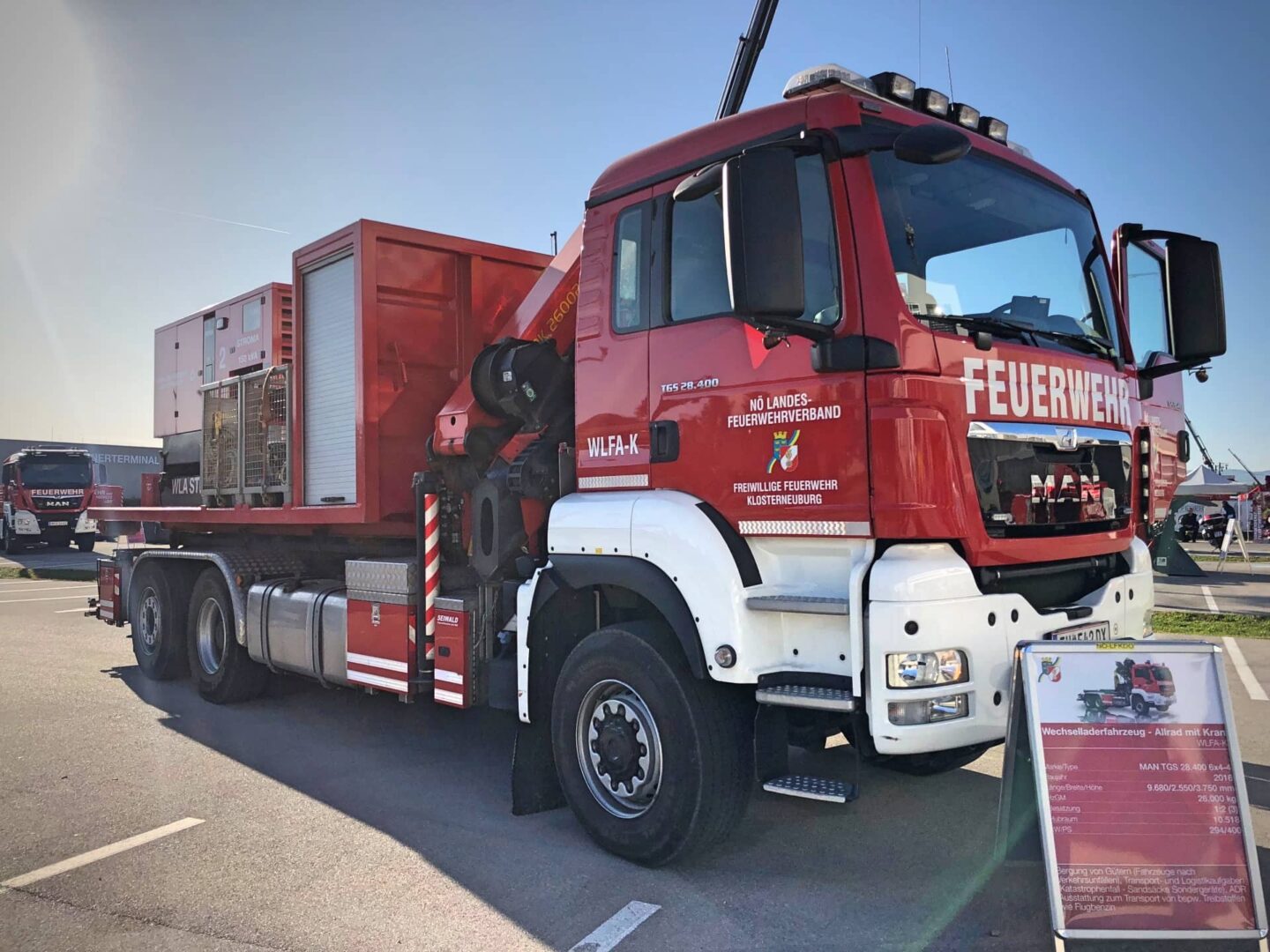 Bei rund 43 Stationen konnten sich die zahlreichen Besucher über das Feuerwehrwesen informieren. Die Feuerwehr Klosterneuburg unterstützte die einzigartige Show mit mehreren Fahrzeugen, darunter die Einsatzleitung, der Teleskoplader, das neue A-Boot und das Wechselladerfahrzeug mit Strom-Plateau.