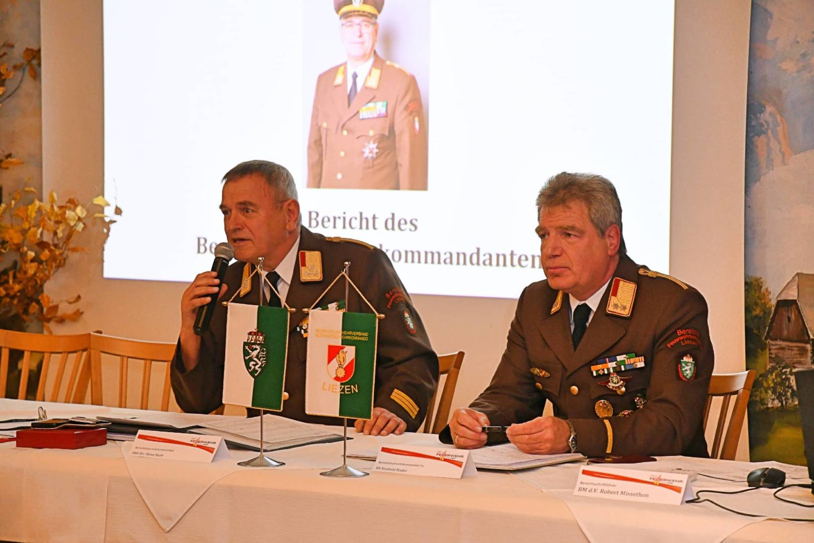 Der diesjährige Kommandantentag des BFV Liezen wurde von Bereichsfeuerwehrkommandanten Oberbrandrat Heinz Hartl am 8. November um 19 Uhr eröffnet mit dem Ziel, diesen kurz und informativ abzuführen. Seine Begrüßungsworte ergingen an Bürgermeister Raimund Hager, Brandrat Reinhold Binder, alle anwesenden Kommandanten und -Stellvertreter sowie die Bereichsbeauftragten. Erfreulicherweise waren 93 der 95 Feuerwehrkommandos anwesend. Im Besonderen begrüsste er den Abschnittskommandanten von Gröbming, ABI Gerd Bartl, der sich aus beruflichen Gründen aus dieser Funktion zurückzieht, 12 Jahre lang stand er dem Abschnitt 02 vor und leitete dabei eine Vielzahl an Katastropheneinsätzen.