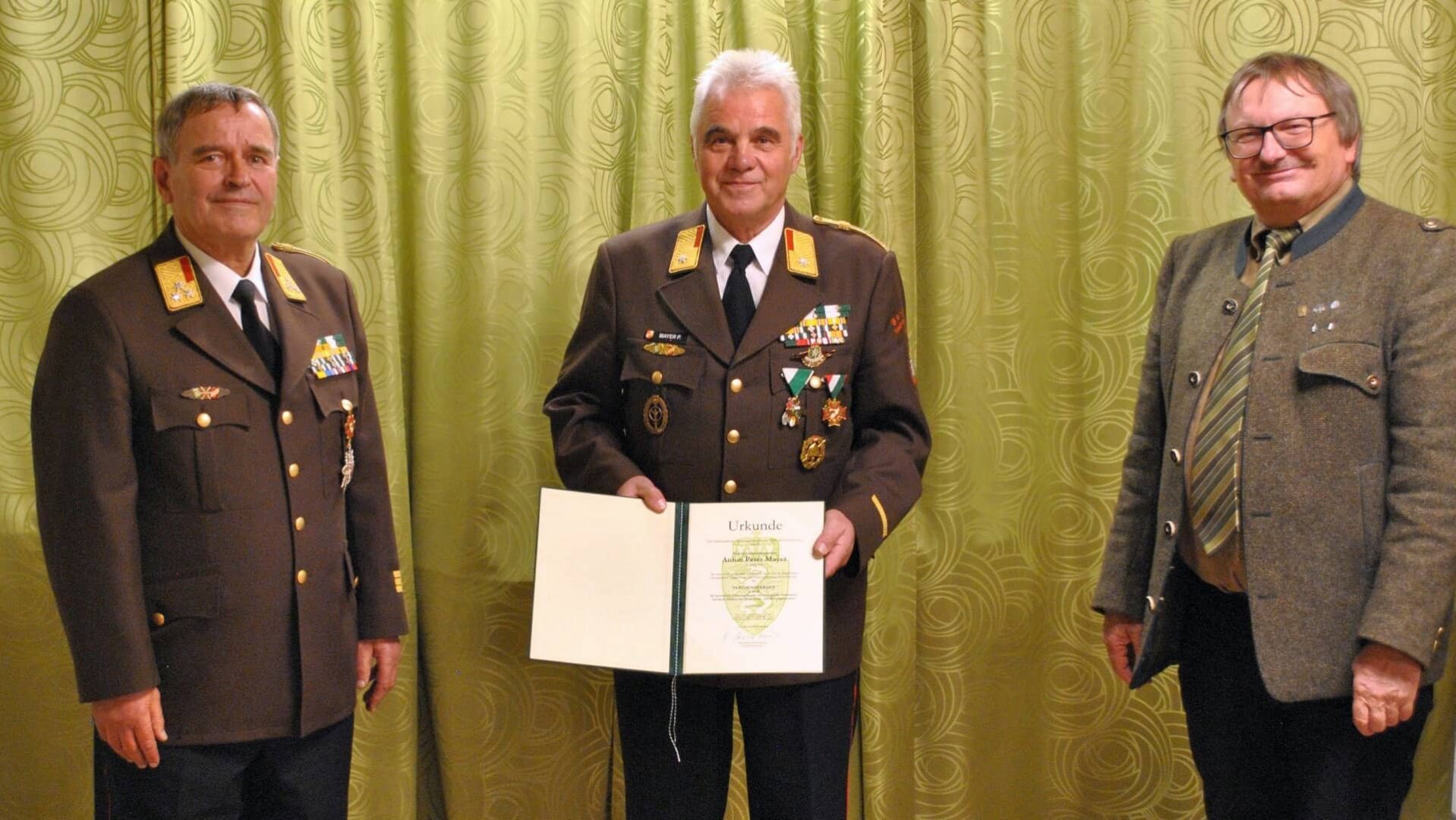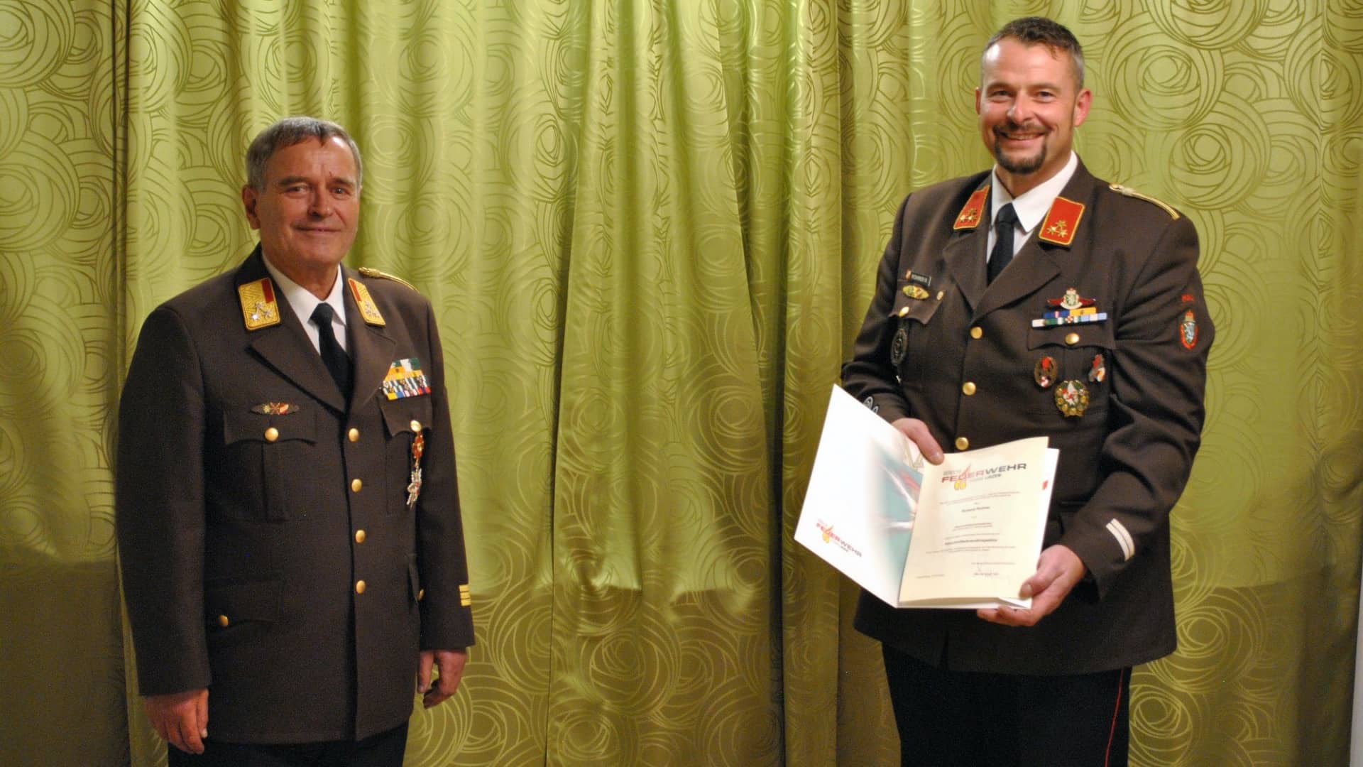 Abschließend wurde ABI Peter Mayer mit dem Verdienstkreuz in Gold sowie dem Verdienstkreuz des BFV 1.Stufe ausgezeichnet. In Würdigung seiner großen Verdienste wurde Mayer außerdem der Ehrendienstgrad E-ABI (Ehren-Abschnittsbrandinspektor) verliehen. Stehende Ovationen der Wahlversammlung würdigten E-ABI Mayer für sein großes Wirken.