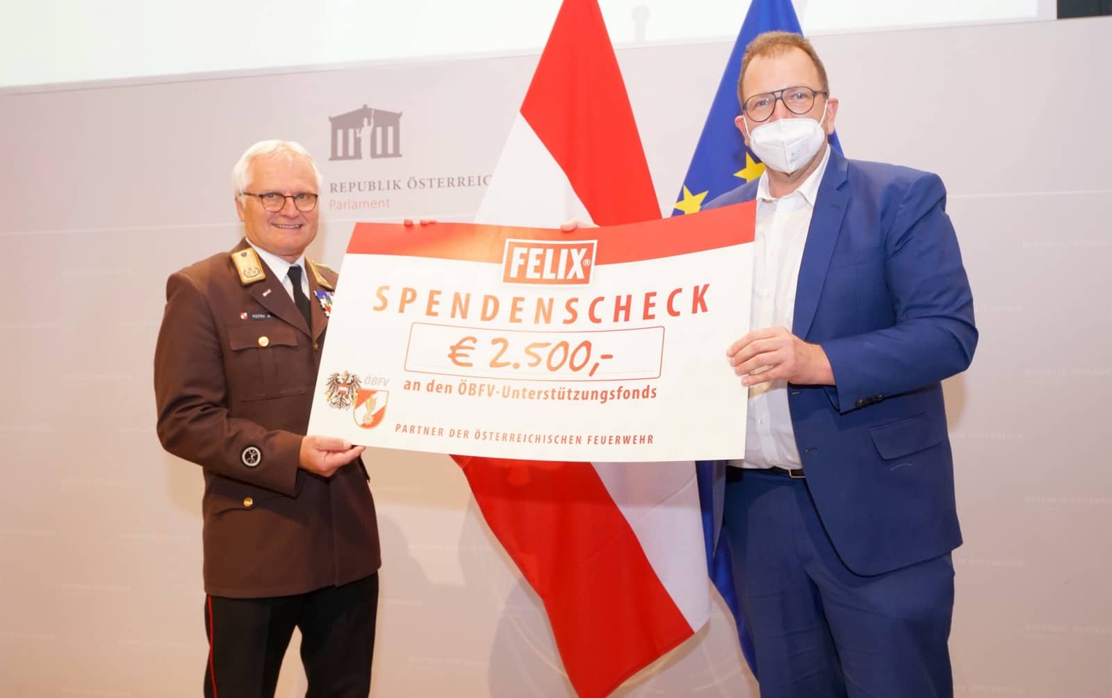 FELIX Austria ist es auch zu verdanken, dass der Österreichische Bundesfeuerwehrverband den ÖBFV Schnellhilfefonds gegründet hat. Dieser Fonds bringt Familien von im Feuerwehreinsatz tödlich verunglückten Mitgliedern eine finanzielle Entlastung, zusätzlich zu den Unterstützungsmechanismen der Landesfeuerwehrverbände. Im Rahmen dieser Veranstaltung überreichte Gulliver Wagner von FELIX Austria einen Spendenscheck in der Höhe von €2.500,- an Feuerwehrpräsident Kern als weiteren finanziellen Beitrag für den ÖBFV-Schnellhilfefonds. „Feuerwehrfrauen und -männer helfen uns tagtäglich. Da ist es nur selbstverständlich ihnen zur Seite zu stehen, wenn Hilfe benötigt wird! Der von FELIX Austria und dem ÖBFV ins Leben gerufene Schnellhilfefonds kann hier rasch und unbürokratisch unterstützen und das ist wichtig“, so Wagner bei der Scheckübergabe.