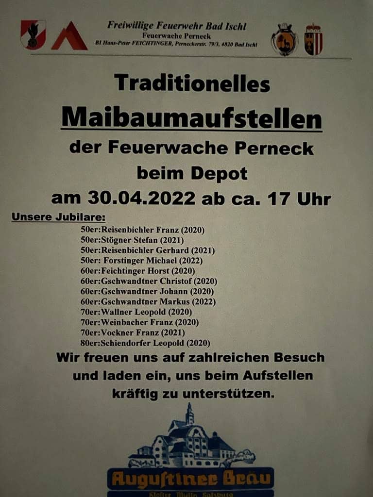 So wird auch am kommenden Samstag, den 30. April 2022, nach zweijähriger Unterbrechung in Perneck – direkt vor dem Feuerwehrhaus der Feuerwache Perneck – wieder ein Maibaum aufgestellt. Beginn ist um 17:00 Uhr.