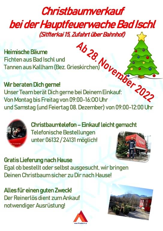 Am Montag, den 28. November 2022 fällt der Startschuss für den alljährlichen Christbaumverkauf bei der Hauptfeuerwache Bad Ischl, Stifterkai 15, Zufahrt über Bad Ischler Bahnhof.