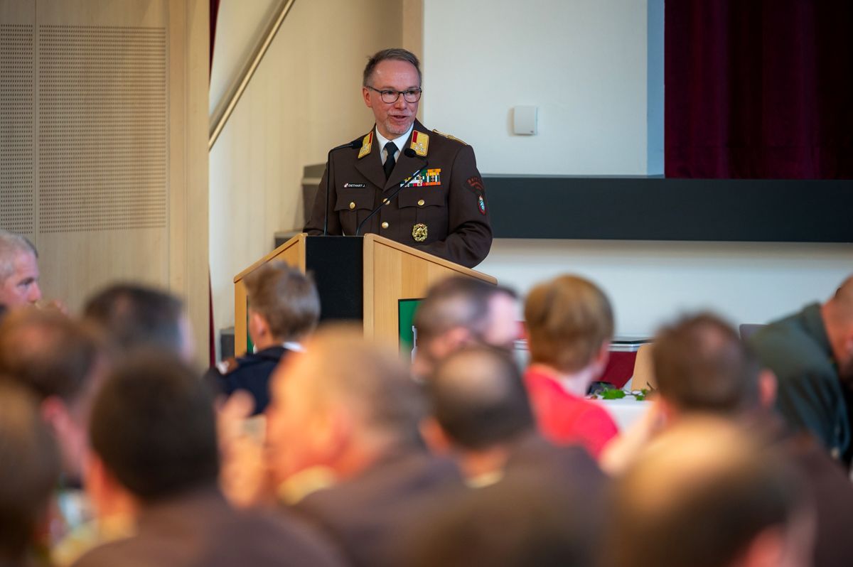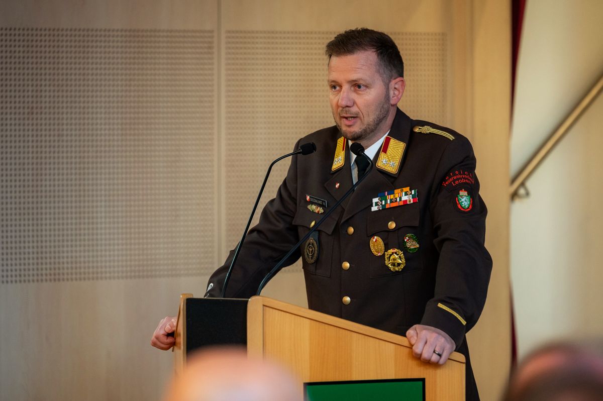 Bereichsfeuerwehrkommandant OBR Ing. Johann Diethard präsentierte im Anschluss den imposanten Leistungskatalog der 26 Freiwilligen Feuerwehren und 6 Betriebsfeuerwehren des Bereichsfeuerwehrverbandes Leoben, der den breiten und umfangreichen Wirkungsbereich der Feuerwehren beschrieb. Durch das flächendeckende Standortkonzept der Feuerwehren konnten im Berichtsjahr 2023 bei 3.218 Einsätzen innerhalb kürzester Zeit auf die unterschiedlichsten Herausforderungen professionell reagiert werden. 360 Brandeinsätze, 2.068 technische Einsätze, 132 Brandsicherheitswachen und 658 Fehlalarme forderten die aktiven Feuerwehrmänner/frauen des Bereiches Leoben.