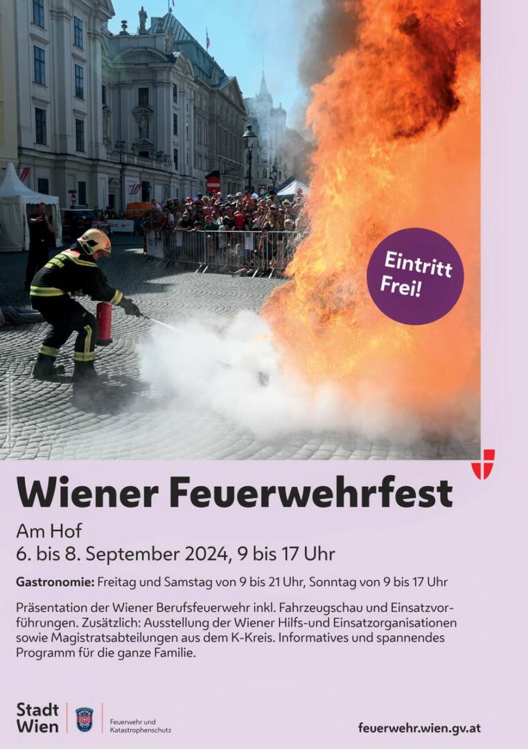 Ab Freitag findet drei Tage lang das traditionelle Feuerwehrfest der Wiener Berufsfeuerwehr Am Hof statt. Die offizielle Eröffnung erfolgt am Freitag, 6.9. um 17:00 Uhr durch politische Vertreter*innen der Stadt Wien und Branddirektor Dipl.-Ing. Mario Rauch. Ab 16:45 Uhr gibt es ein Platzkonzert der Polizeimusik Wien.
